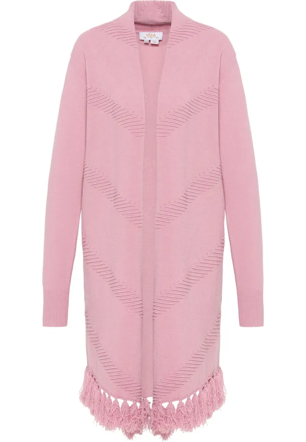 Dit lange vest van usha FESTIVAL heeft aantrekkelijke kwastjes aan de zoom en lineaire breipatronen. Het model is gemaakt van een hoogwaardige viscosemix en heeft een losse pasvorm. De open pasvorm is relaxed en de lange sjaalkraag past perfect in het silhouet. Gebreid vest