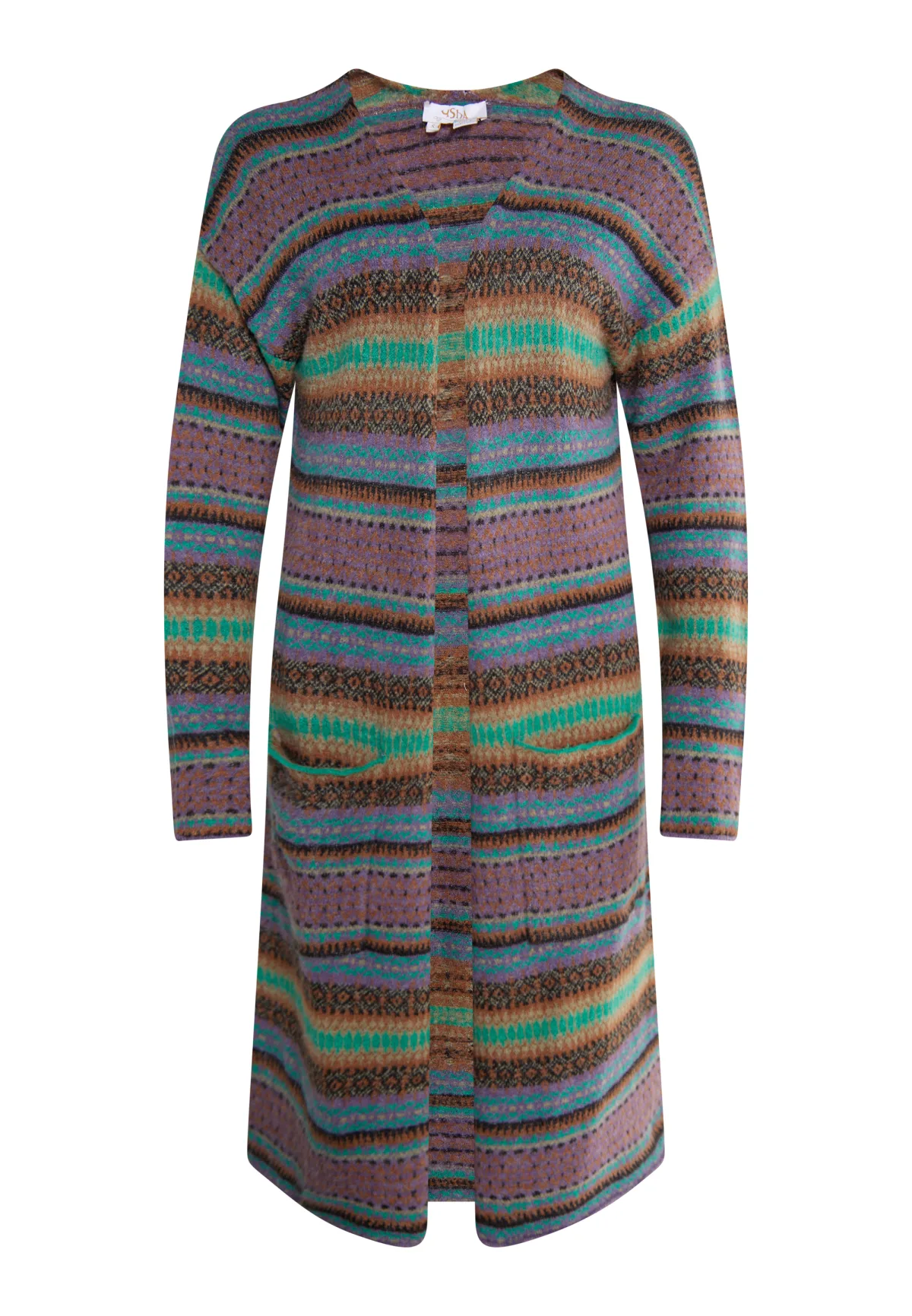Het lange vest van usha FESTIVAL heeft een kleurrijk Fair Isle intarsia-patroon. Het slanke, lange model is gemaakt van een zachte garenmix, terwijl de losse, open pasvorm perfect werkt zonder sluiting. Met zijn herfstkleurencombinaties vormt hij een ideale aanvulling op je jeanskleding. Gebreid vest