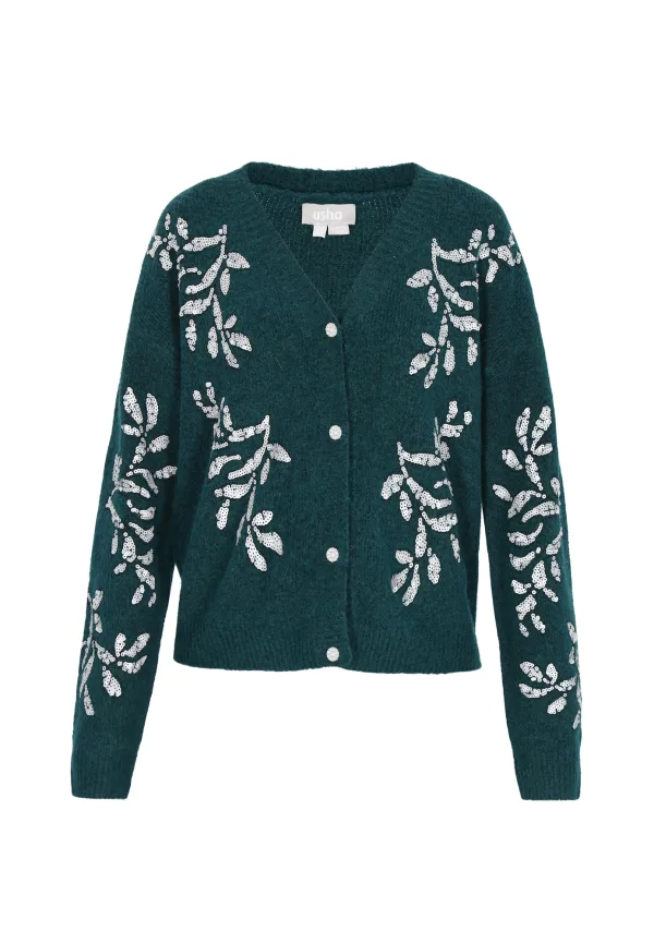 Design: Geribbelde kraag; Type sluiting: Knoopsluiting; Materiaal: Knitwear; Halstype: V-hals; Motief: Bloemenprint; Details: Pailletten; Extra's: Voelt zacht aan; Pasvorm: Normale pasvorm; Armlengte: Lange mouw; Lengte: Normale lengte