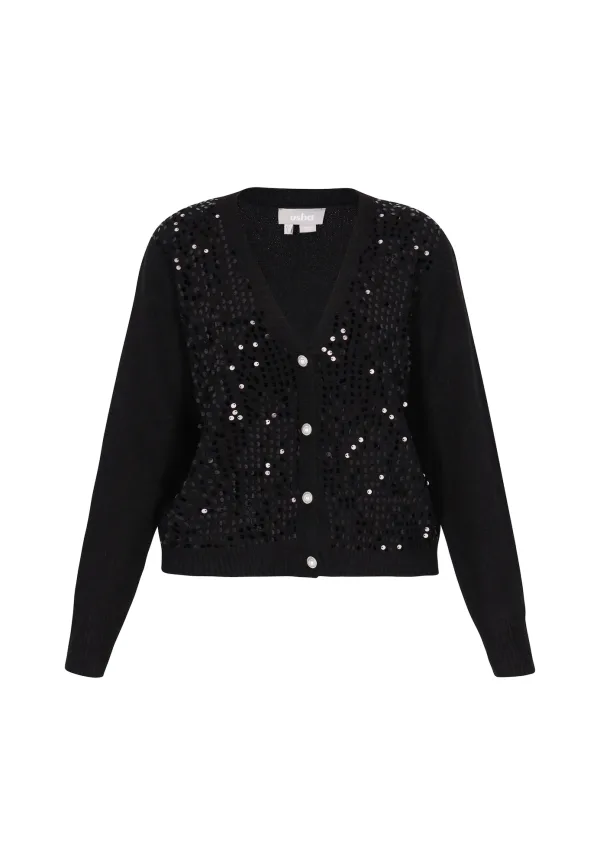 Design: Knop placket, Geribd ceintuurtje; Type sluiting: Knoopsluiting; Materiaal: Knitwear; Halstype: V-hals; Motief: Effen; Details: Pailletten; Extra's: Applicaties, Label patch/label flag; Pasvorm: Normale pasvorm; Armlengte: Lange mouw; Lengte: Normale lengte