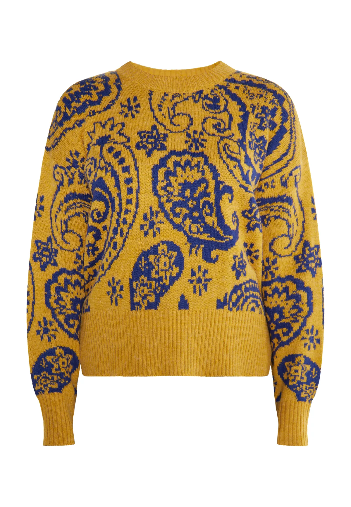 Verrijk je herfst-winter gebreide kleding met de jacquard paisley trui van usha FESTIVAL. De stevige maar toch zachte garenmix zorgt voor veel comfort en stabiliteit, terwijl de brede geribde manchetten met zijsplitten zorgen voor een relaxed silhouet. Casual op jeans of smalle pantalon. Gebreide trui