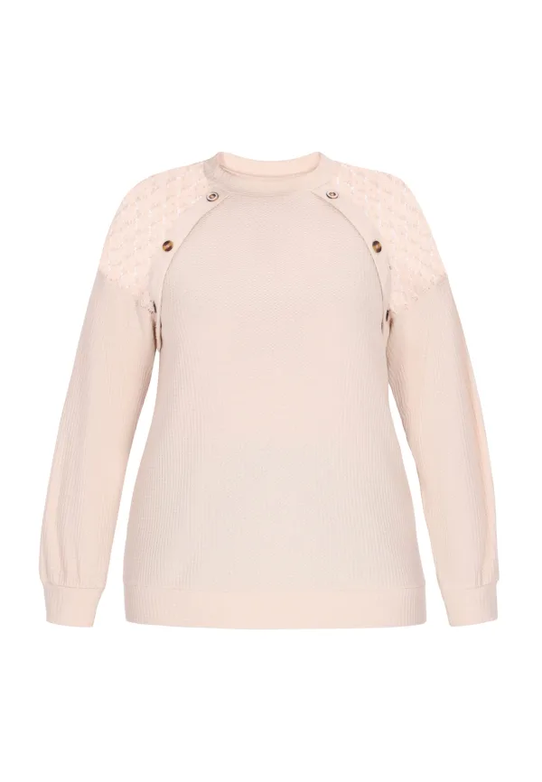 Ontdek een stijlvolle blouse, ontworpen voor de modebewuste vrouw. Dit plus-size exemplaar heeft een ronde hals en lange mouwen, geaccentueerd door elegante kanten panelen op de schouders. De wafelstructuur geeft diepte aan het effen ontwerp, terwijl decoratieve knopen en geplooide manchetten de casual maar toch chique uitstraling versterken. Ideaal voor alledaagse mode uit onze Plus Size Collectie. Grote maat blouse