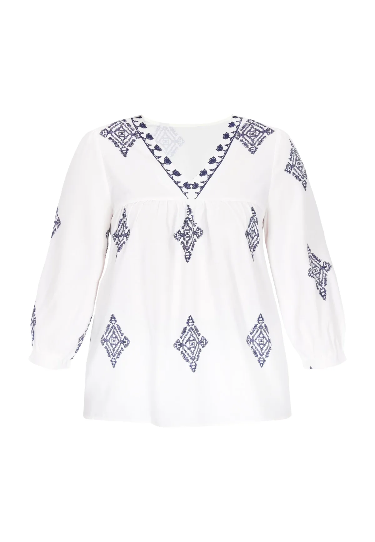 Verfijn je stijl met deze plus-size blouse met V-hals en een heerlijke boho-print. De driekwartmouwen zorgen voor een casual stijl, terwijl de geweven stof comfort garandeert. De losse pasvorm en stijlvolle contrasterende biezen maken deze blouse perfect voor festivals of casual uitjes. Hij maakt deel uit van de Plus Size Collectie. Grote maat blouse