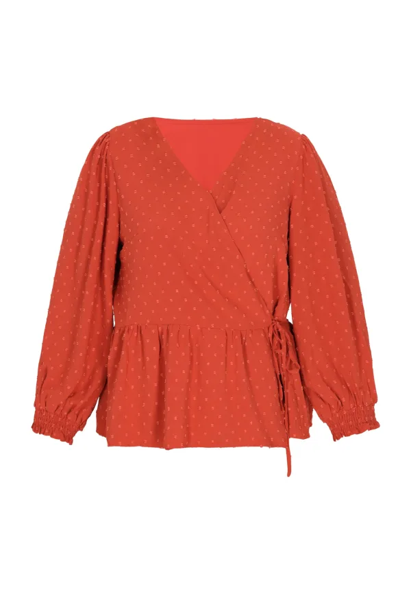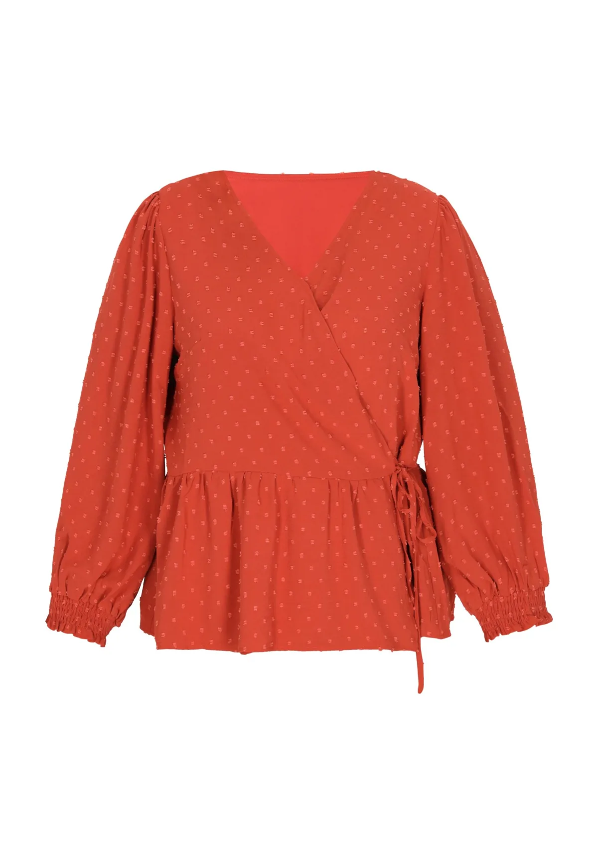 Ontdek deze elegante plus size wikkelblouse, ontworpen met een fladderende V-hals en bisschopsmouwen. De opstaande taille zorgt voor een verstelbare pasvorm, waardoor je silhouet prachtig wordt benadrukt. Versierd met een chique stippenpatroon, is dit kledingstuk met lange mouwen perfect voor vele stylingsstijlen. Dit product maakt deel uit van de Plus Size-collectie. Grote maat blouse