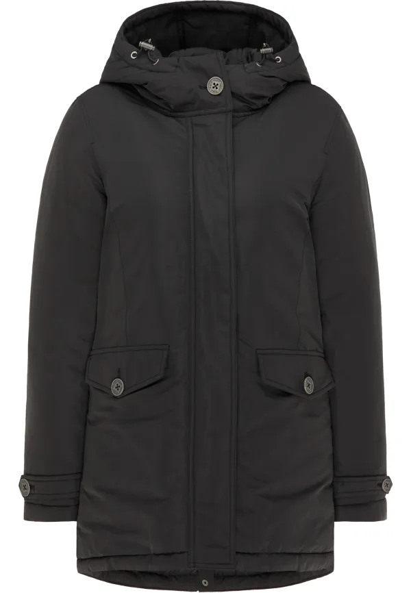 Deze jas van usha wordt gegarandeerd je nieuwe metgezel in het koude herfst/winter seizoen! Het hoogwaardige model presenteert zich in tijdloze kleuren, een klassiek design en brengt u betrouwbaar door de koude dagen. Deze geweldige jas is gemaakt van een zeer zacht en matglanzend materiaal aan de buitenkant en heeft een capuchon met een elastisch trekkoord en twee klepzakken om uw benodigdheden in op te bergen. Het sluit met een rits, die slim wordt verborgen door een drukknoopsluiting. De jas is stijlvol gewatteerd aan de binnenkant en gevoerd met 100% dierlijke veren. De jas heeft ook bijpassende mouwgespen en een korte split aan de achterkant, die het ontwerp prachtig aanvullen. Jas