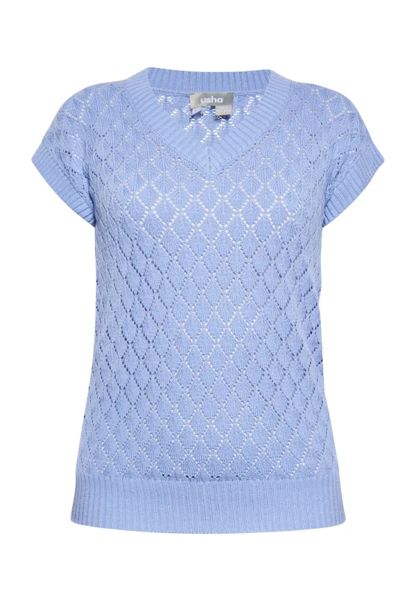 Dit gebreide, opengewerkte vest met V-hals en ruitpatroon zorgt voor een doorschijnend effect. Geribbelde bies aan de korte mouwen en onderkant voor een perfecte pasvorm. Dit sweatshirtvest is ideaal voor vrijetijdskleding en is ontworpen om het bovenlichaam te accentueren. Dankzij het ingewikkelde patroon past hij ook in elegante outfits. Jumper