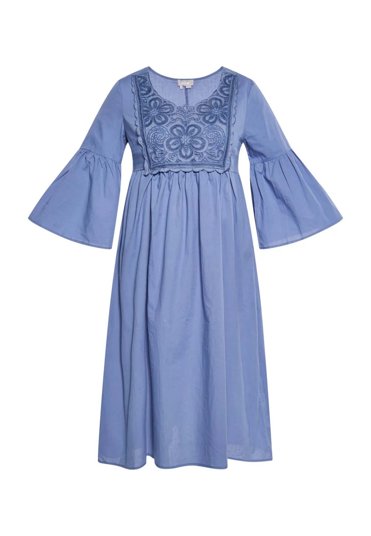 Maak kennis met een prachtige midi-jurk met korte mouwen en klokvormige mouwen. Deze boho-geïnspireerde jurk heeft ingewikkeld kantborduurwerk in een bloemmotief op het aansluitende lijfje. De taille is iets verhoogd, waardoor er een vouw ontstaat voor extra volume. Ideaal voor etnische of festivalstijlen, de jurk ziet er chic en stijlvol uit. Jurk