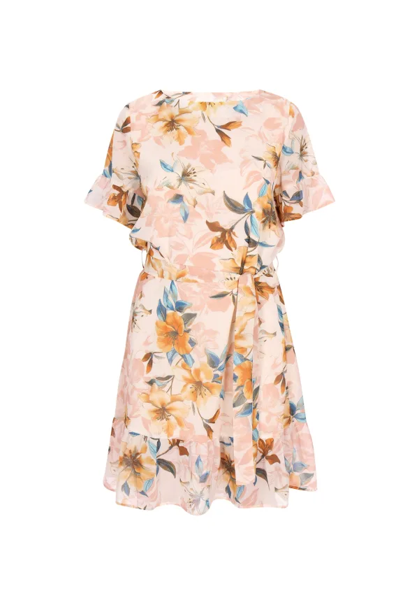 Design: Gevoerde zoom/rand, Tailleriem; Materiaal: Chiffon; Halstype: Ronde hals; Motief: Bloemenprint; Details: Volant, Gedrapeerd; Extra's: All-over patroon, Gladde stof, Riemlussen; Lengte: Kort/mini; Snit: Getailleerd; Pasvorm: Normale pasvorm; Armlengte: Kwartmouw
