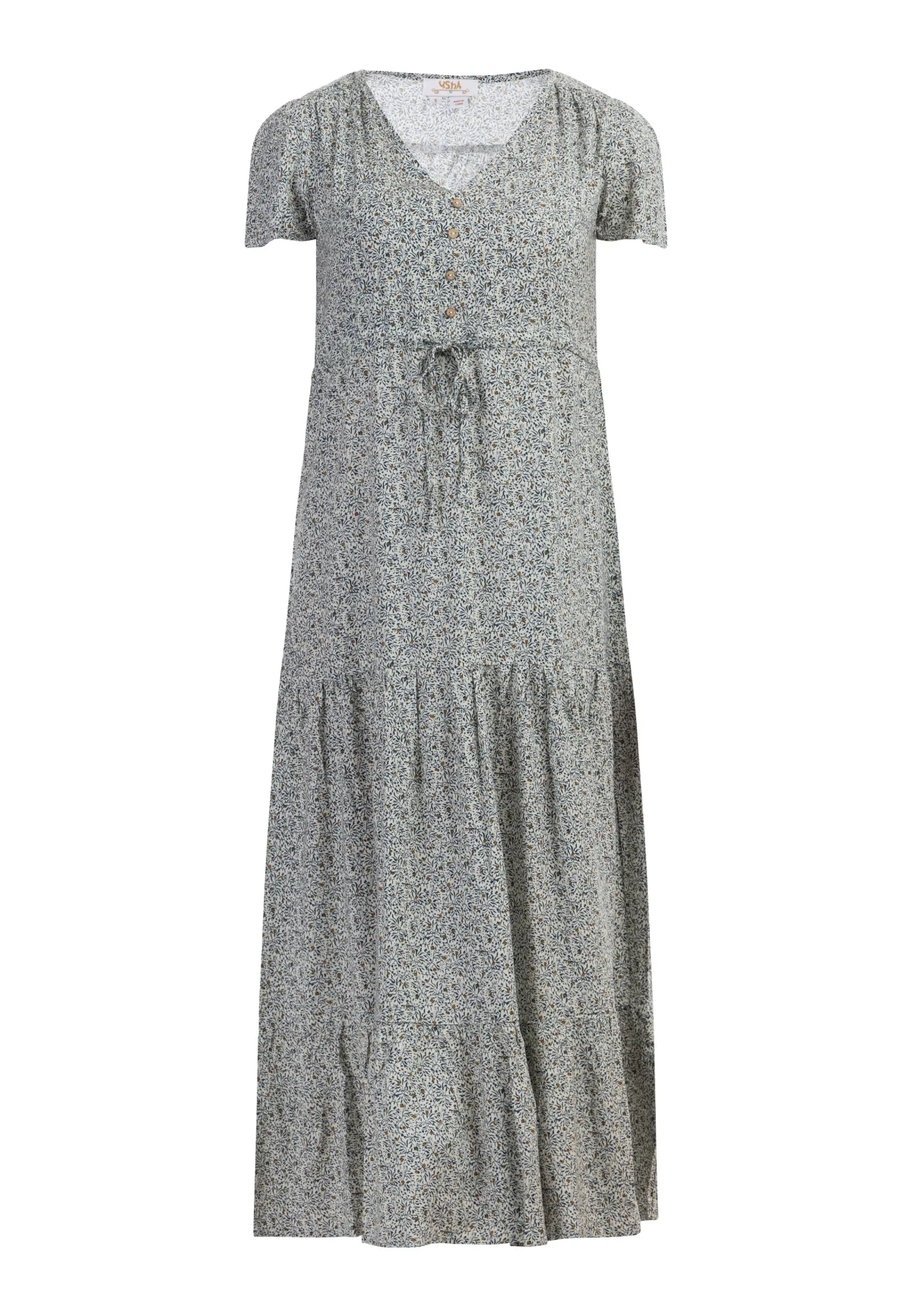Deze casual midi-jurk van usha FESTIVAL heeft een trendy festivallook met zijn fijne bloemmotief. De vloeiende afwerking van vederlichte viscose benadrukt vakkundig de vrouwelijke A-lijn. Een strikband op taillehoogte verandert de stijl, net als de gelaagde volants op de rok. De korte mouwen en de aantrekkelijke V-hals met kleine knoopsluiting onderstrepen het design. Jurk