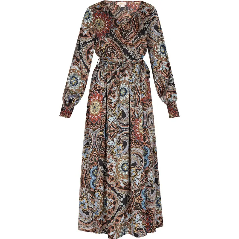Deze elegante jurk heeft een intrigerend ontwerp met patronen, een flatterende middellange snit en een aansluitende tailleband voor een perfecte pasvorm. De ingetogen halslijn vormt een aanvulling op de lange mouwen, die eventueel voorzien zijn van manchetten. De vloeiende rok valt sierlijk rond de knie of halverwege de kuit en benadrukt de lichtgewicht stof die prachtig valt. Jurk