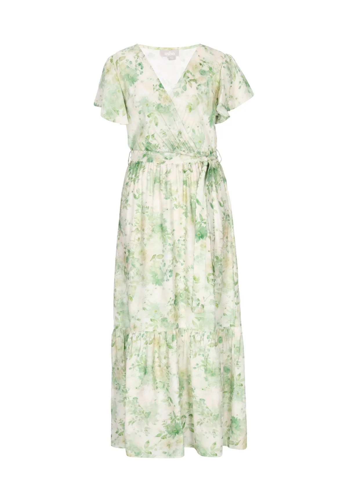 Design: Gevoerde zoom/rand; Materiaal: Viscose; Halstype: V-hals; Motief: Bloemenprint; Details: Volant, Gedrapeerd, Wikkel design; Extra's: All-over patroon, Riemlussen; Lengte: 7/8 lengte; Snit: Getailleerd; Pasvorm: Normale pasvorm; Armlengte: Kwartmouw