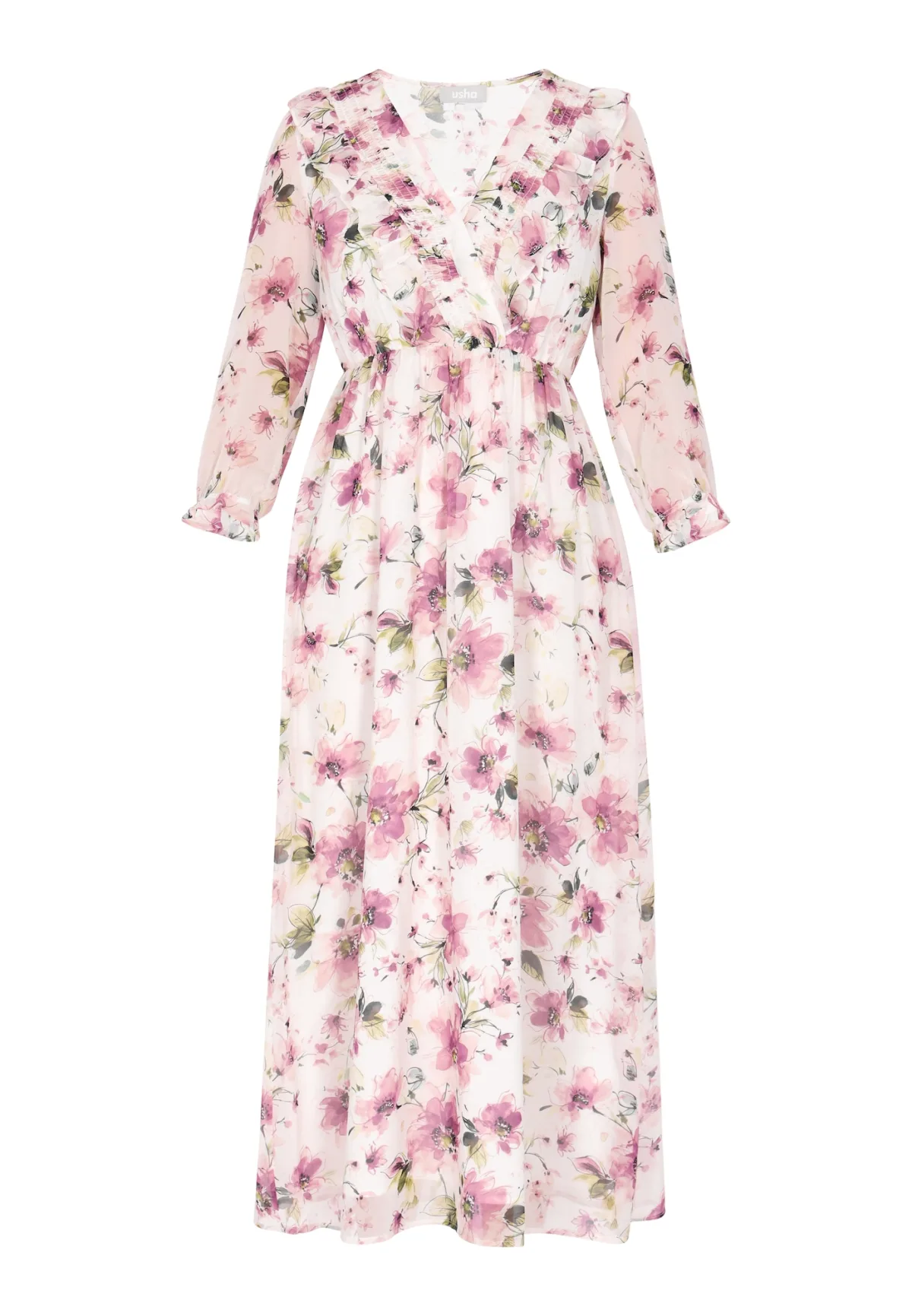 Design: Gevoerde zoom/rand; Halstype: V-hals; Motief: Bloemenprint; Details: Ruches, Gedrapeerd; Extra's: All-over patroon; Lengte: 7/8 lengte; Snit: Getailleerd; Pasvorm: Normale pasvorm; Armlengte: Driekwart mouw