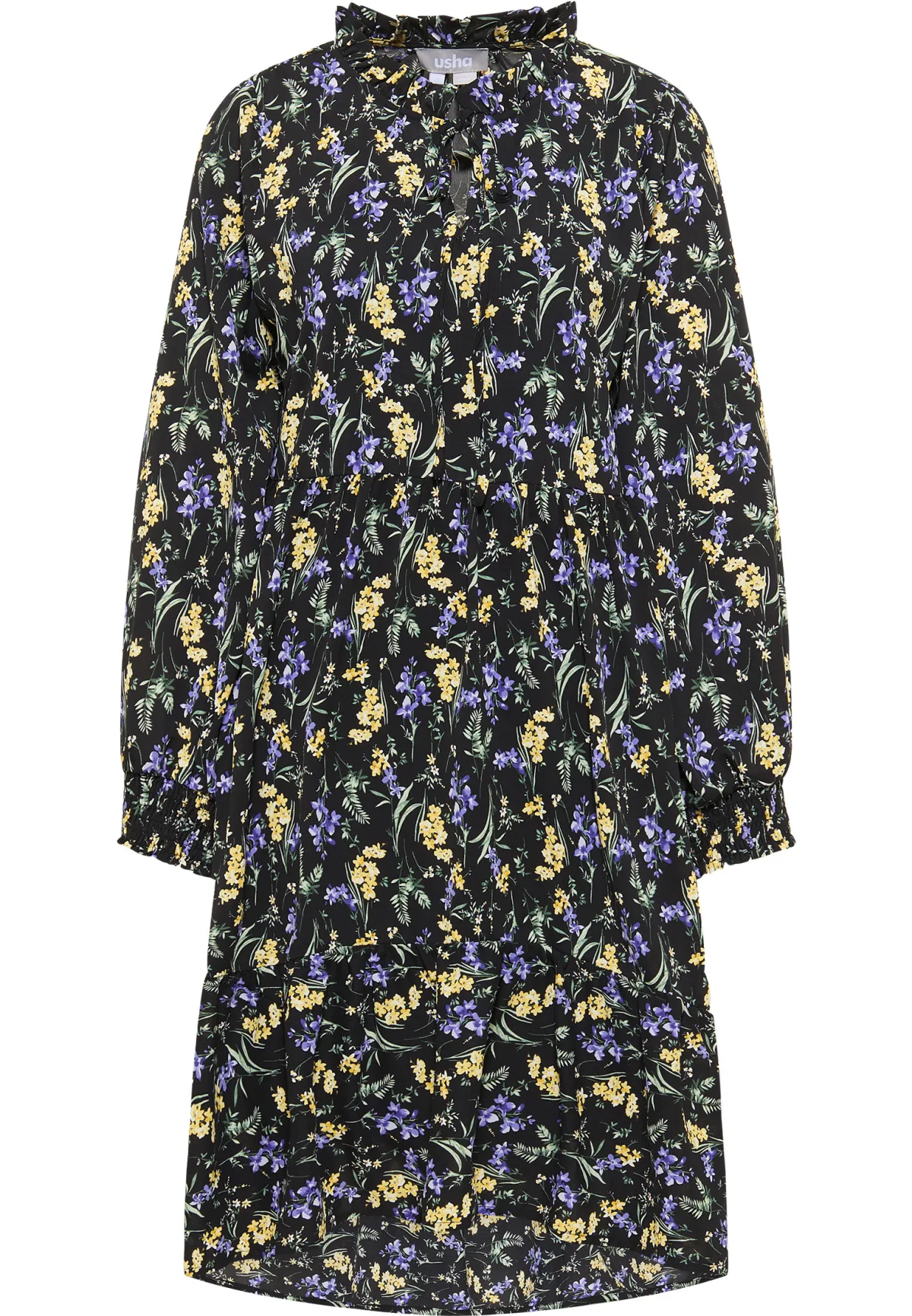 Dankzij het romantische bloemenpatroon zal deze knielange jurk van usha u veroveren met zijn modieuze charme. Het model is gemaakt van een zijdezacht materiaal en heeft een losse pasvorm. De hooggesloten en geruwde opstaande kraag met strikband, de ruches en de mouwen met gesmokte boorden zorgen voor trendy accenten.