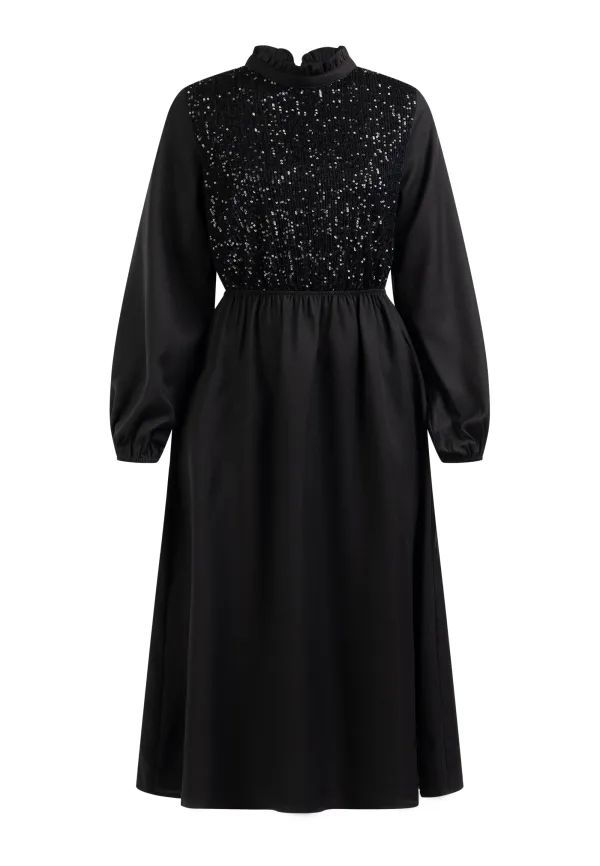 Deze prachtige jurk van usha maakt indruk met zijn details. De hooggesloten kraag met ruches geeft de jurk een verfijnde look, terwijl de elastische taille en mouwen je figuur flatteren. De armlengte, de lengte van de jurk en de pailletten op de borst maken de jurk een geweldige optie voor de feestdagen. jurk met lange mouwen