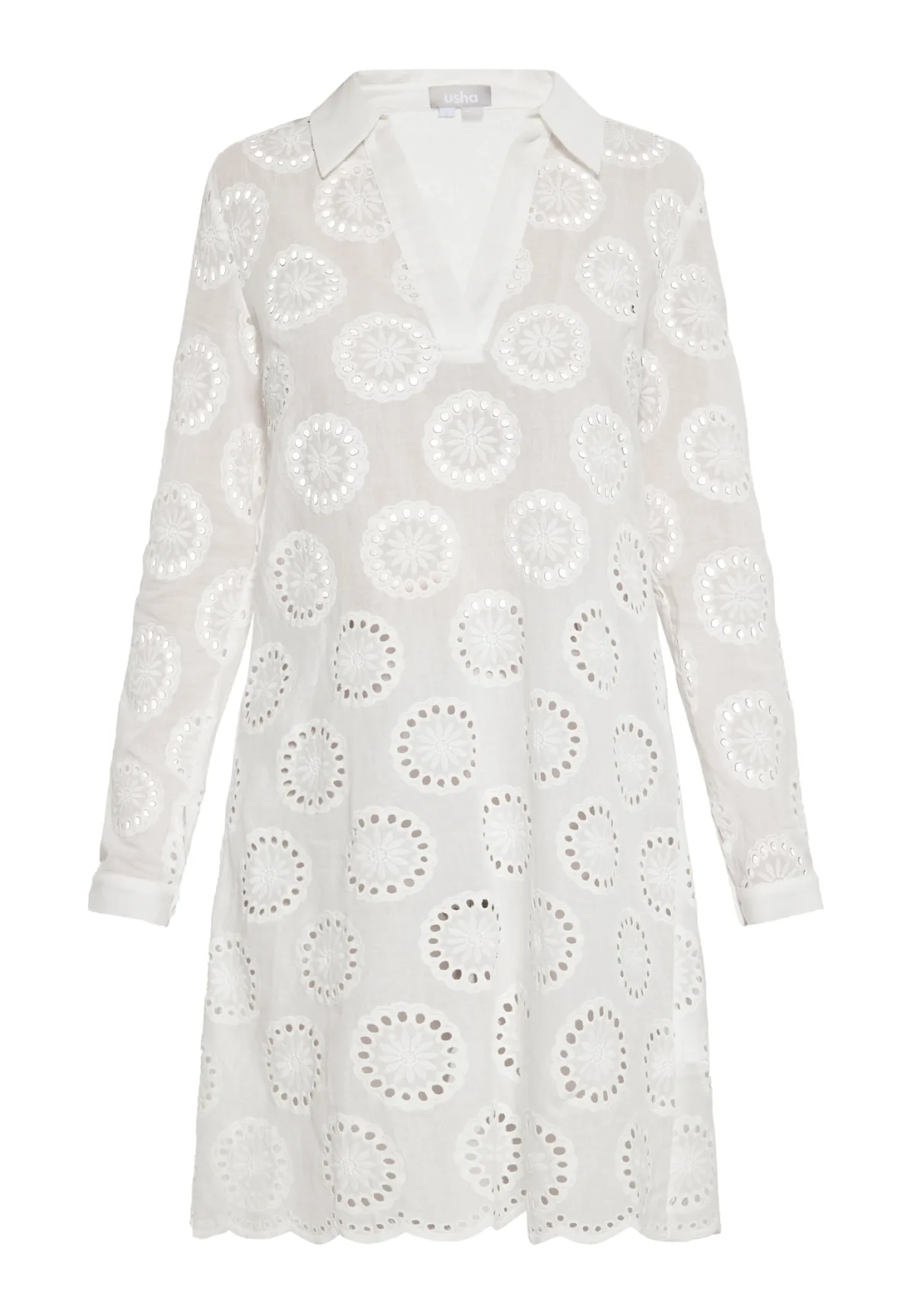 Deze katoenen jurk met oogjes heeft een ontwerp van richelieu-kant met ingewikkelde uitgesneden details. De V-halslijn en kraag voegen een vleugje verfijning toe, terwijl het A-lijnsilhouet een ontspannen, boho-chique sfeer biedt. Lange mouwen met manchetten zorgen voor een op maat gemaakte afwerking van deze geweven jurk, waardoor een zwierige drapering ontstaat voor een stijlvolle look. Jurk