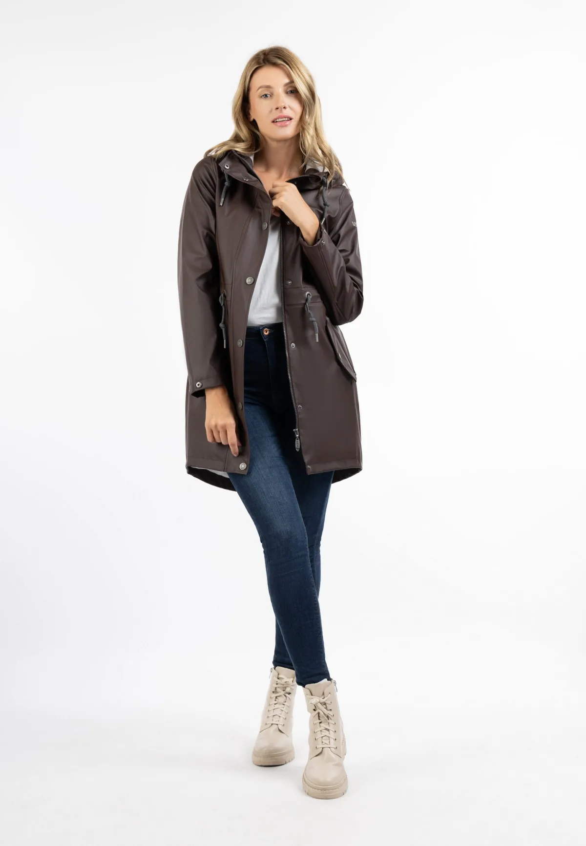 Op regenachtige dagen biedt deze usha mackintosh heerlijke bescherming. Het gecoate materiaal is wind- en waterdicht en nodigt uit tot wandelen in weer en wind. De grote capuchon met gegraveerde oogjes en stijlvolle koorden biedt extra bescherming tegen de regen, die vooral op stormachtige dagen goed van pas komt. Ook de drukknoopsluiting boven de ritssluiting en de schuine klepzakken optimaliseren het jack op het gebied van weersbestendigheid. De zachte jersey voering zorgt voor een aangenaam draagcomfort.