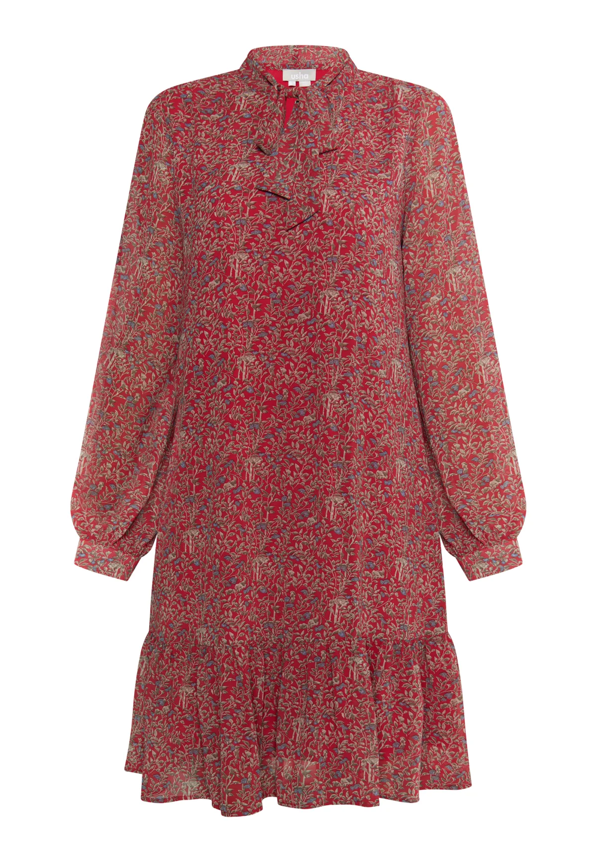 De vrouwelijke midi-jurk van usha is gemaakt van een delicaat, soepel materiaal en bedrukt met een bloemenprint. Het kleine opstaande kraagje met strikje en de gelaagde zoom met ruches zorgen voor een romantische look. Dankzij de lange mouwen met manchetten kan de jurk ook op frissere dagen met laarzen gedragen worden. Jurkje mini met lange mouwen