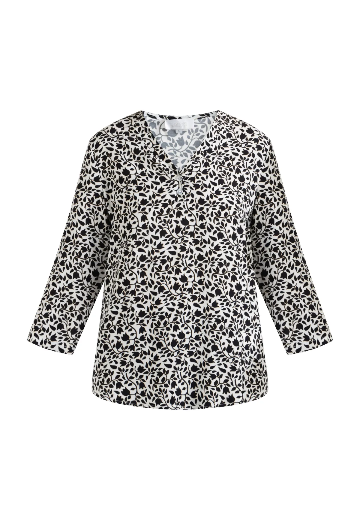 Geen voering/geen voering, geen vulling De licht getailleerde overhemdblouse van usha maakt indruk met zijn prachtige bloemenpatroon dat schittert in duidelijke vormen en kleuren. Gemaakt in Italië, heeft het shirt een vrouwelijke V-hals met twee kleine knoopjes en elegante driekwartmouwen. Het lichtgewicht viscose materiaal maakt het comfortabel om te dragen. Blouse