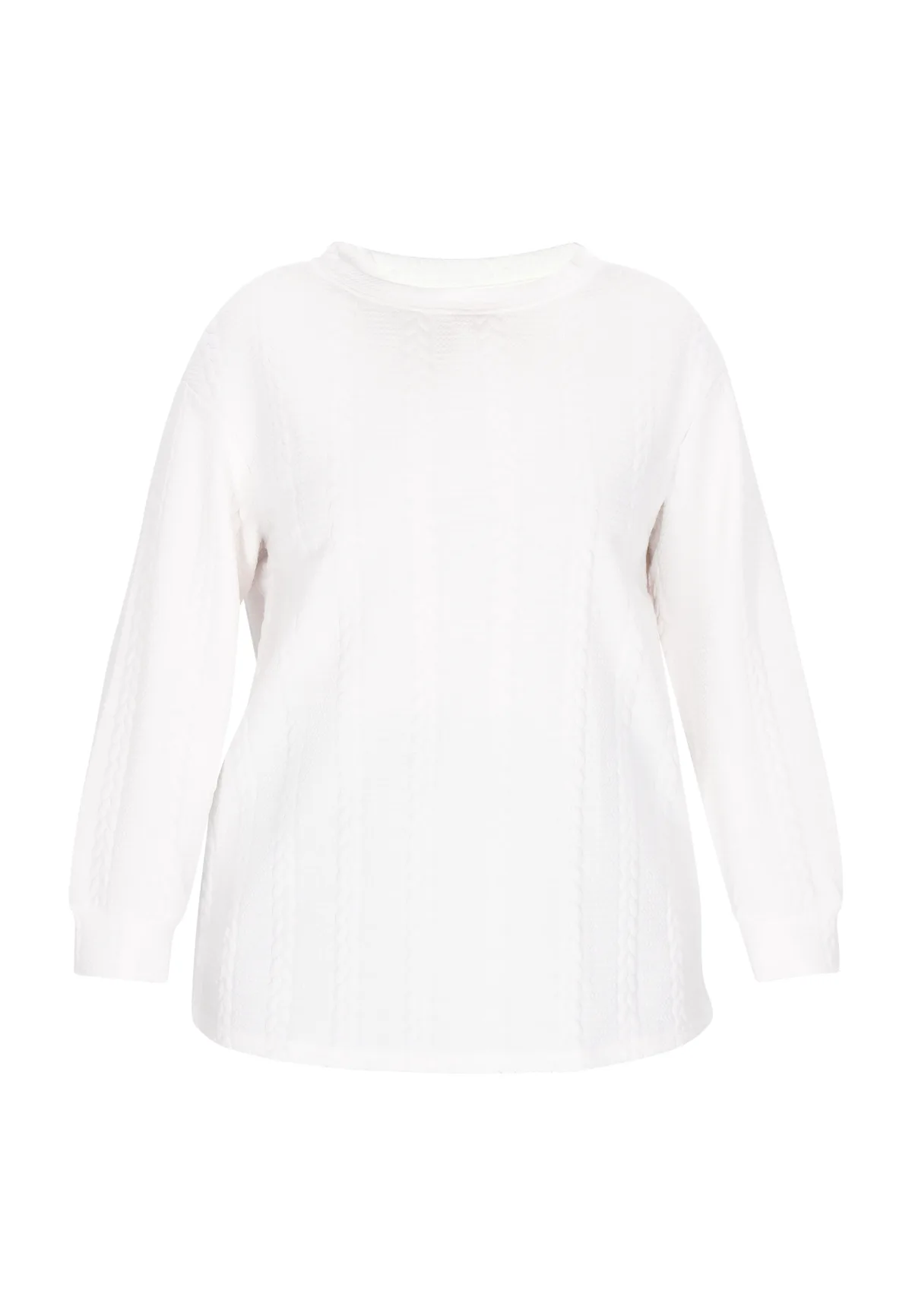 Deze losvallende sweater met ronde hals en lange mouwen is een stijlvolle aanvulling op je dagelijkse outfit. Het kabelpatroon zorgt voor textuur, terwijl de brede manchetten en afgeronde zoom de casual look versterken. Ideaal voor vrouwen met een maatje meer die op zoek zijn naar comfort en veelzijdigheid in hun garderobe. Het maakt deel uit van de Plus Size Collectie. Plussize sweatshirt