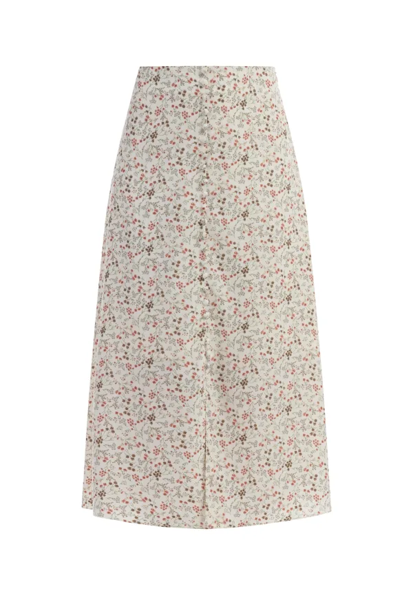 Het delicate bloemenpatroon geeft de rok van usha een vrouwelijke uitstraling. Het slanke model met uitlopende pasvorm brengt romantiek in beeld. Met de decoratieve, met stof beklede knopen aan de voorkant is de rok in het midden gespleten, wat de vrouwelijkheid nog eens extra ondersteunt. Het model wordt afgerond door een soepele binnenvoering en een ritssluiting aan de zijkant. Rock