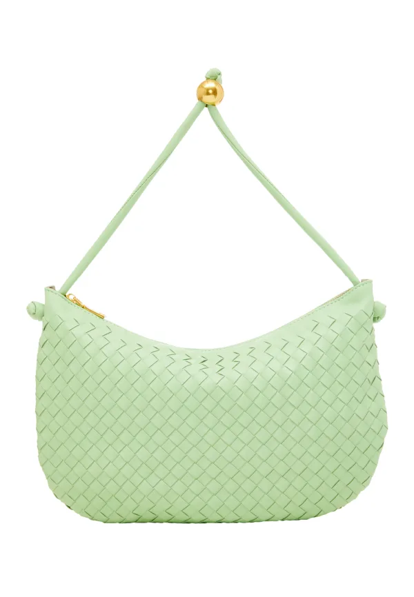 Maak kennis met een middelgrote handtas met een halfronde vorm en een platte bodem voor extra stabiliteit. De bovenste handgreep is versierd met kralenversieringen, wat een vleugje verfijning toevoegt. Met een handige ritssluiting en een binnenvak voor organisatie. Gemaakt van ecoleer met een gevlochten patroon, straalt deze stijlvolle tas elegantie en charme uit.