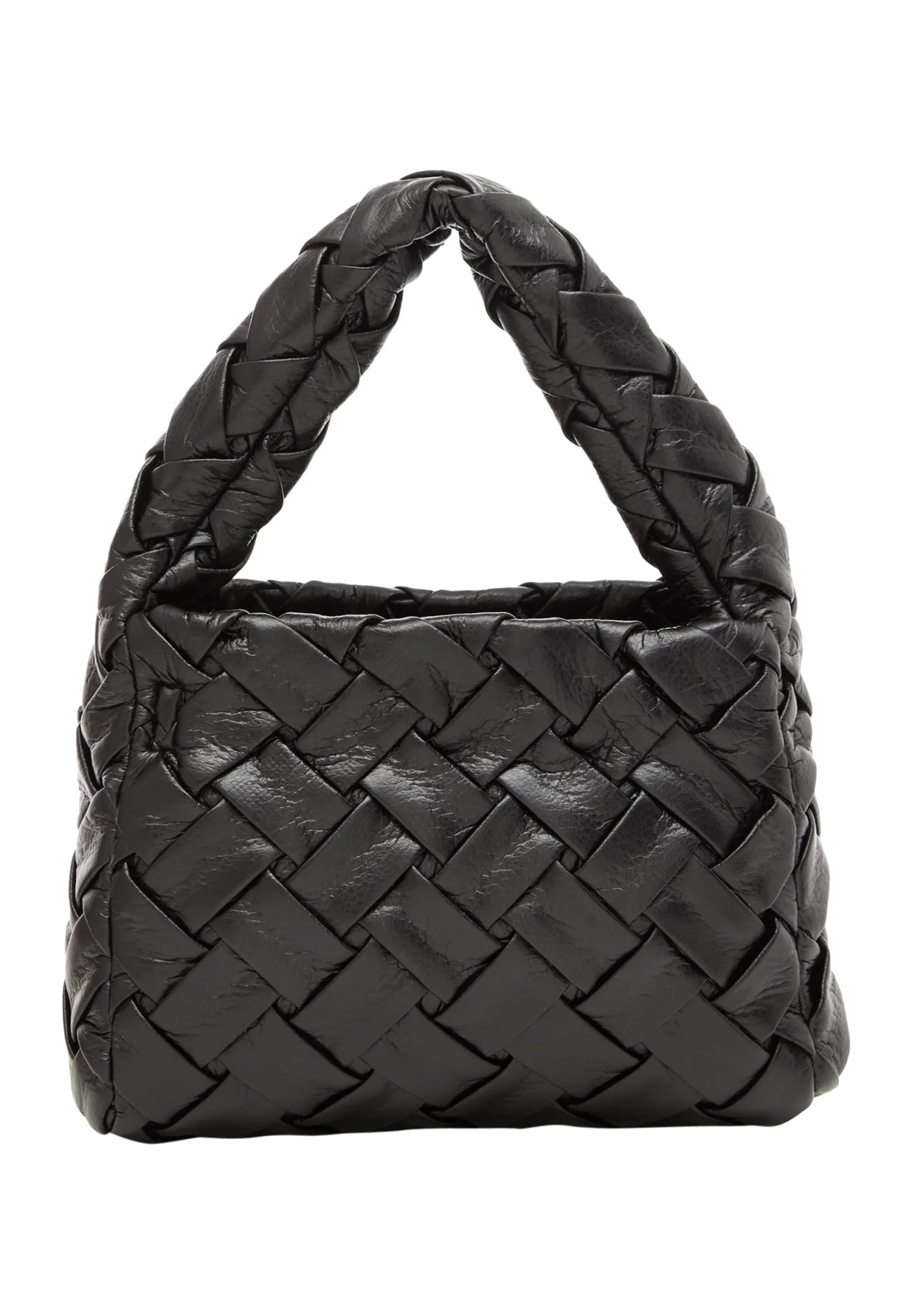 De handtas heeft een unieke geweven textuur met een verweven patroon dat een gewatteerd effect creëert. De zachte, gewatteerde structuur en het dikke handvat, eveneens versierd met hetzelfde geweven ontwerp, bieden een harmonieuze esthetiek. Het handvat loopt van links naar rechts en biedt een comfortabele grip voor gemakkelijk dragen.