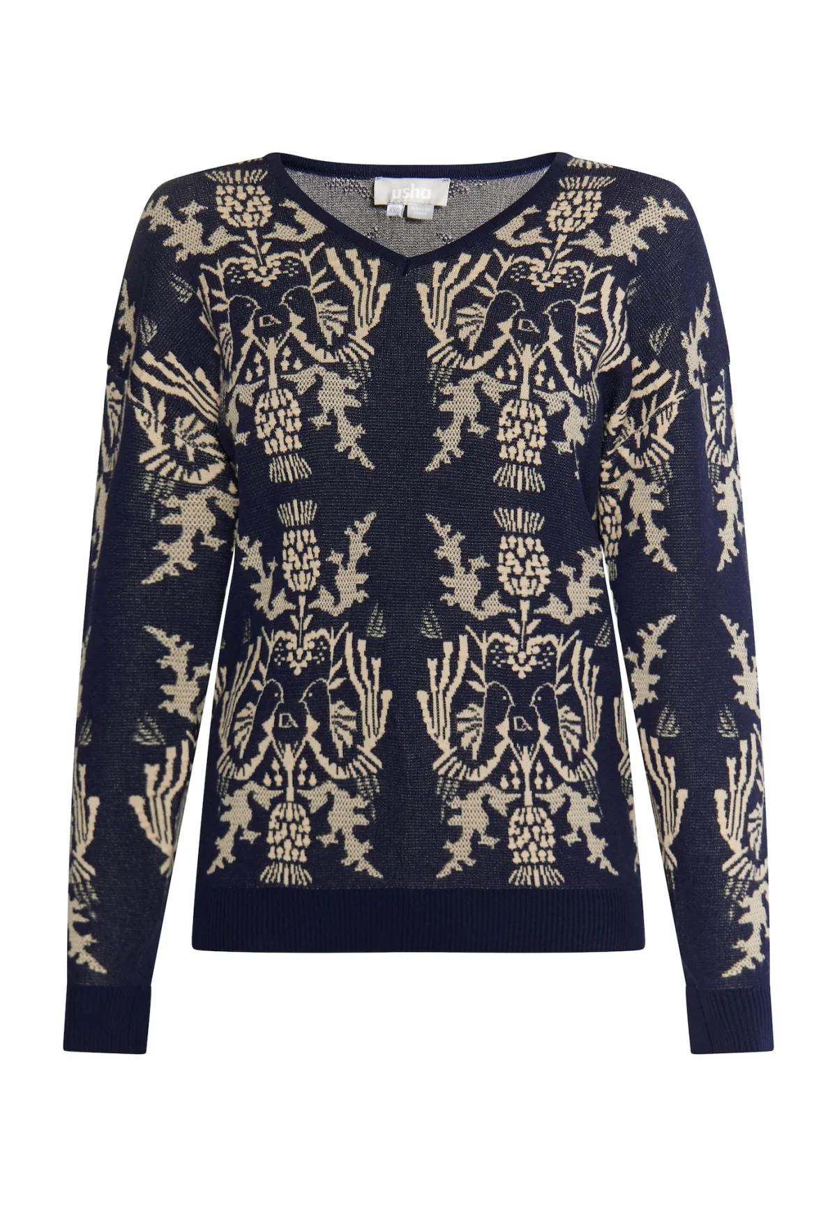 Het all-over intarsiapatroon van bloemen en vogels geeft de trui van usha een heel individuele look. Met zijn zachte viscosegarenmix en geribde gebreide stijl past het model uitstekend in het nieuwe seizoen. Met zijn vrouwelijke V-hals en nonchalant overgesneden schouders is hij een welkome metgezel voor alle winteroutfits. Gebreide trui