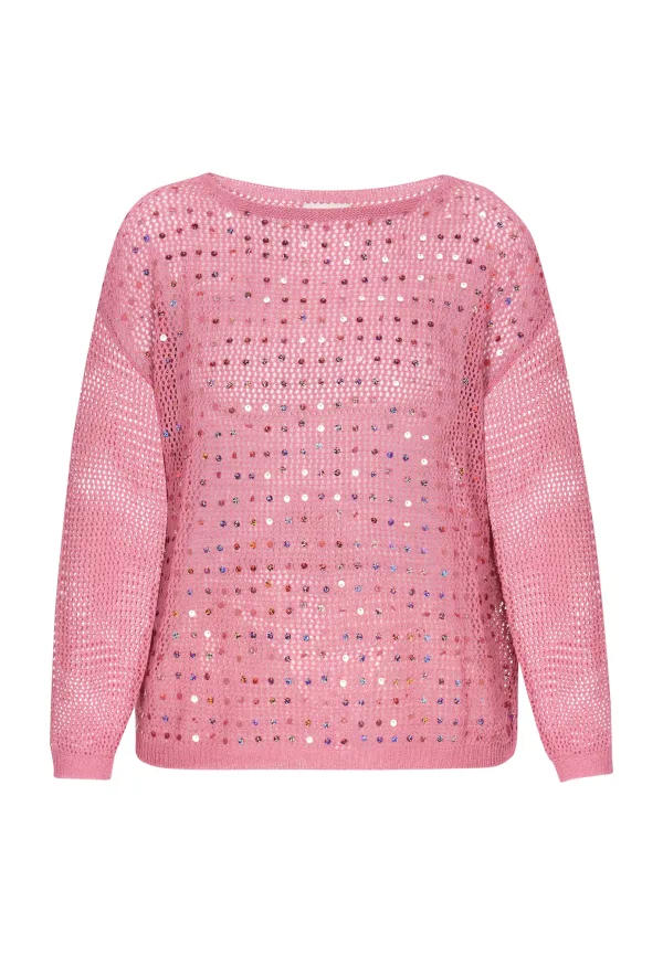 Design: Geribbelde kraag, Geribd ceintuurtje, Overcut schouder; Materiaal: Knitwear; Halstype: Ronde hals; Motief: Effen; Details: Pailletten, Mesh; Extra's: Applicaties, Fully fashioned; Pasvorm: Losse pasvorm; Armlengte: Lange mouw; Lengte: Normale lengte