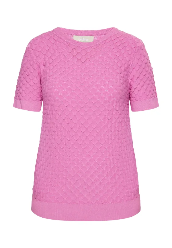 Verrijk je breicollectie met de creatieve trui met korte mouwen in een extravagante schaallook. Het bijzondere ontwerp is door usha gemaakt van een zachte viscosemix. Het slanke silhouet maakt indruk met korte mouwen en geribde gebreide manchetten aan de ronde hals, mouwen en zoom. Gebreide trui