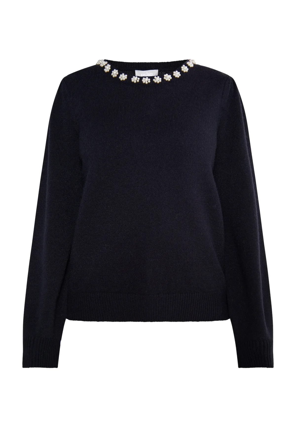 Deze elegante trui van usha siert je zowel overdag als 's avonds. Het zachte garenmengsel was versierd met parels bij de halslijn en harmonieus versierd met kleine bloemen. De klassieke vorm en comfortabele geribde manchetten complementeren het harmonieuze ontwerp. Gebreide trui