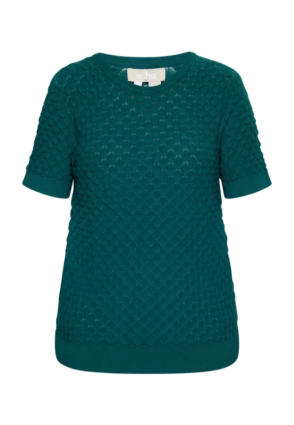 Verrijk je breicollectie met de creatieve trui met korte mouwen in een extravagante schaallook. Het bijzondere ontwerp is door usha gemaakt van een zachte viscosemix. Het slanke silhouet maakt indruk met korte mouwen en geribde gebreide manchetten aan de ronde hals, mouwen en zoom. Gebreide trui