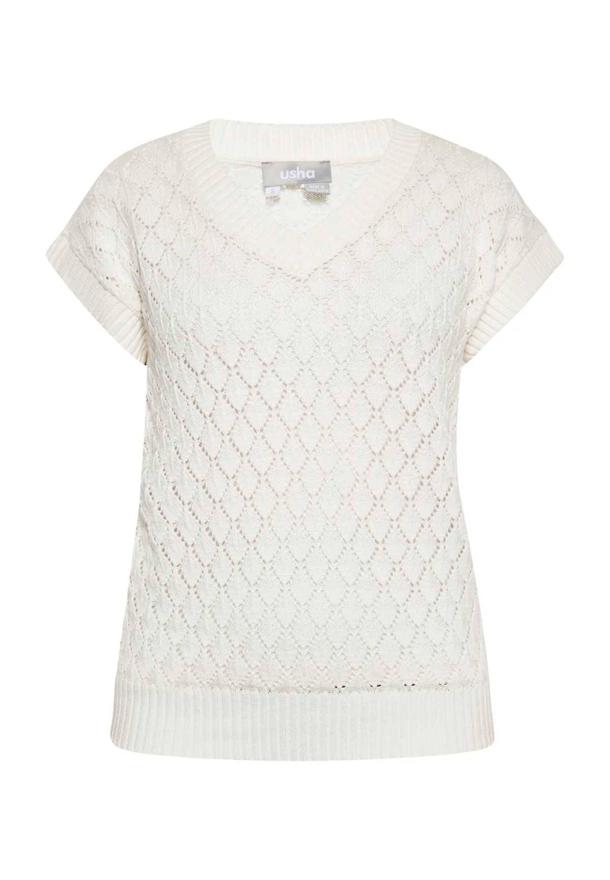 Dit gebreide, opengewerkte vest met V-hals en ruitpatroon zorgt voor een doorschijnend effect. Geribbelde bies aan de korte mouwen en onderkant voor een perfecte pasvorm. Dit sweatshirtvest is ideaal voor vrijetijdskleding en is ontworpen om het bovenlichaam te accentueren. Dankzij het ingewikkelde patroon past hij ook in elegante outfits. Jumper