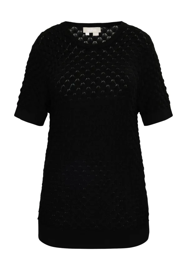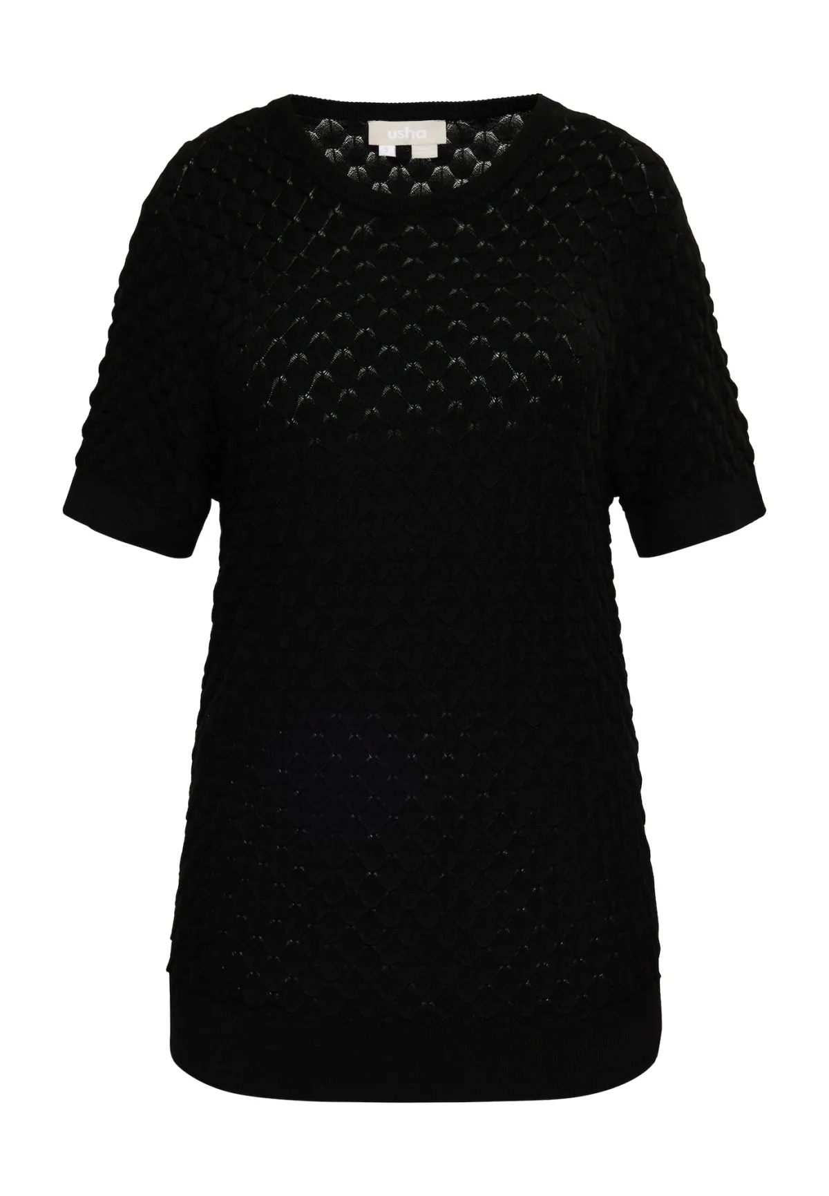 Verrijk je breicollectie met de creatieve trui met korte mouwen in een extravagante schaallook. Het bijzondere ontwerp is door usha gemaakt van een zachte viscosemix. Het slanke silhouet maakt indruk met korte mouwen en geribde gebreide manchetten aan de ronde hals, mouwen en zoom. Gebreide trui