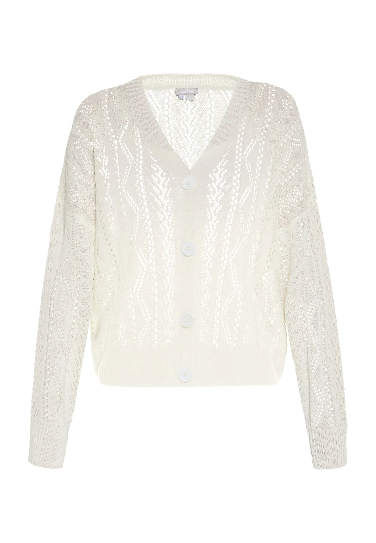 Geef je casual stijl een boost met dit delicate opengewerkte vest, de fladderende V-hals en de knoopsluiting aan de voorkant. De ingewikkelde kantachtige steken voegen een decoratieve flair toe, terwijl de lange mouwen en geribde manchetten voor comfort zorgen. Dit relaxed-fit vest is gemaakt van rekbaar breiwerk en is perfect om de hele dag als laagje te dragen. Vest