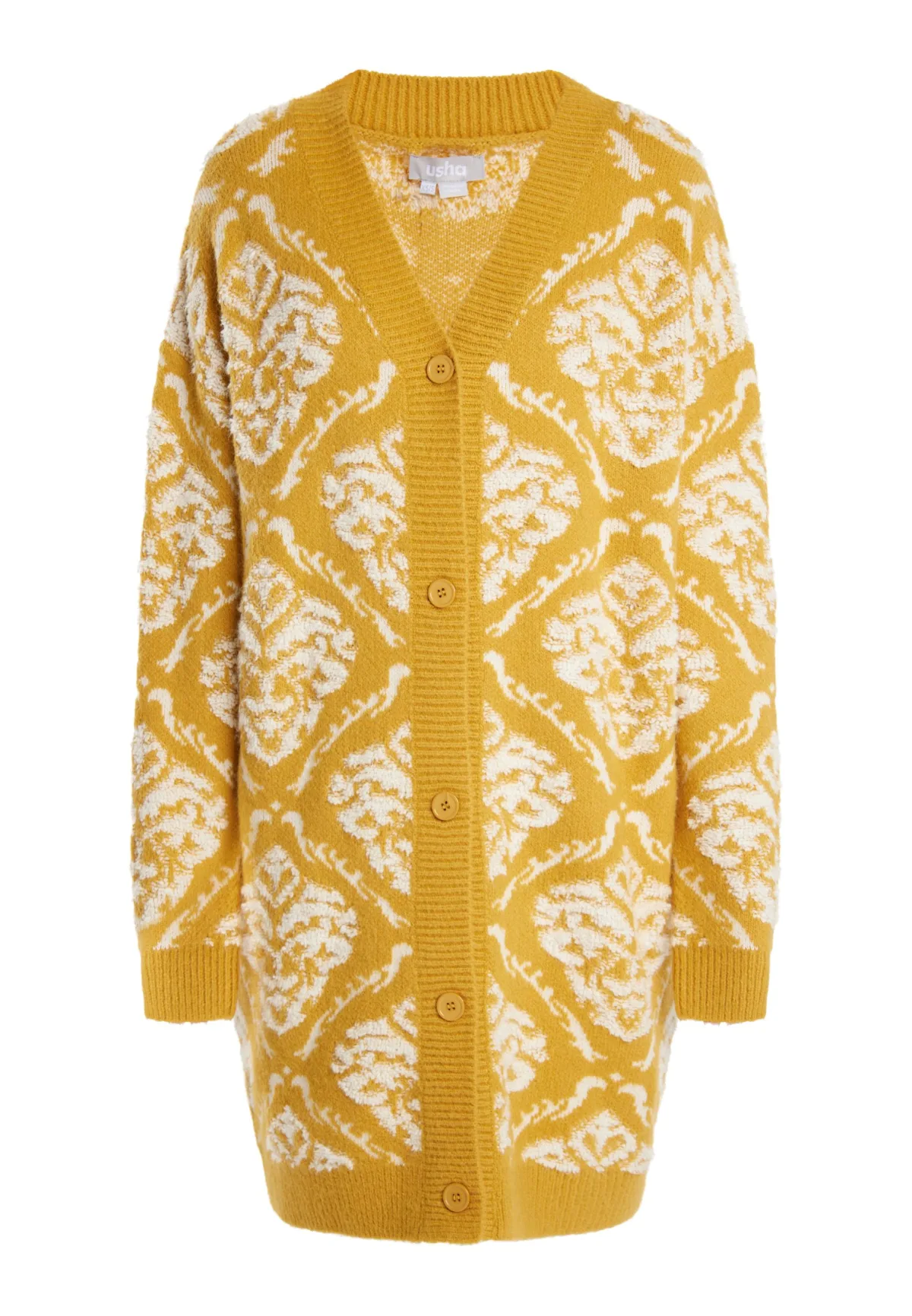 Elastisch en zacht, maar toch grof gebreid en met uitgebreide inlegsels, zo presenteert het lange en comfortabele vest van usha zich. Met zijn vrouwelijke V-hals en geribde manchetten is hij een welkome metgezel voor alle winteroutfits. Stijlvol op jeans of een broek van fijne stof. Gebreide trui