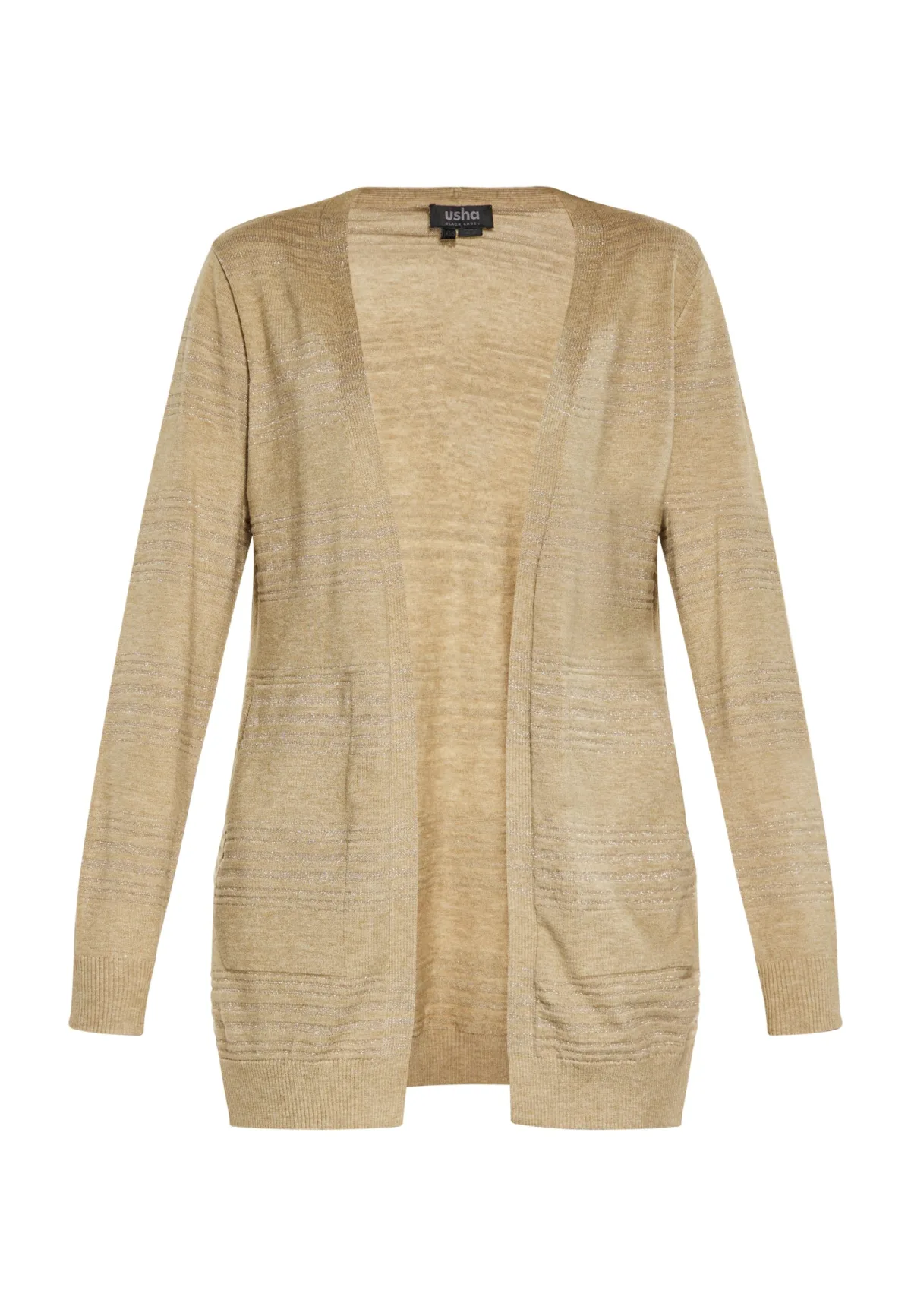 Onthul elegant met dit open vest met metallic strepen. Dit gebreide vest heeft lange mouwen en een rechte zoom, waardoor het een tijdloze charme uitstraalt. De geribbelde structuur bij de manchetten en onderzoom voegt finesse toe aan dit delicate gestreepte vest, waardoor het perfect is om in stijl te dragen. Vest