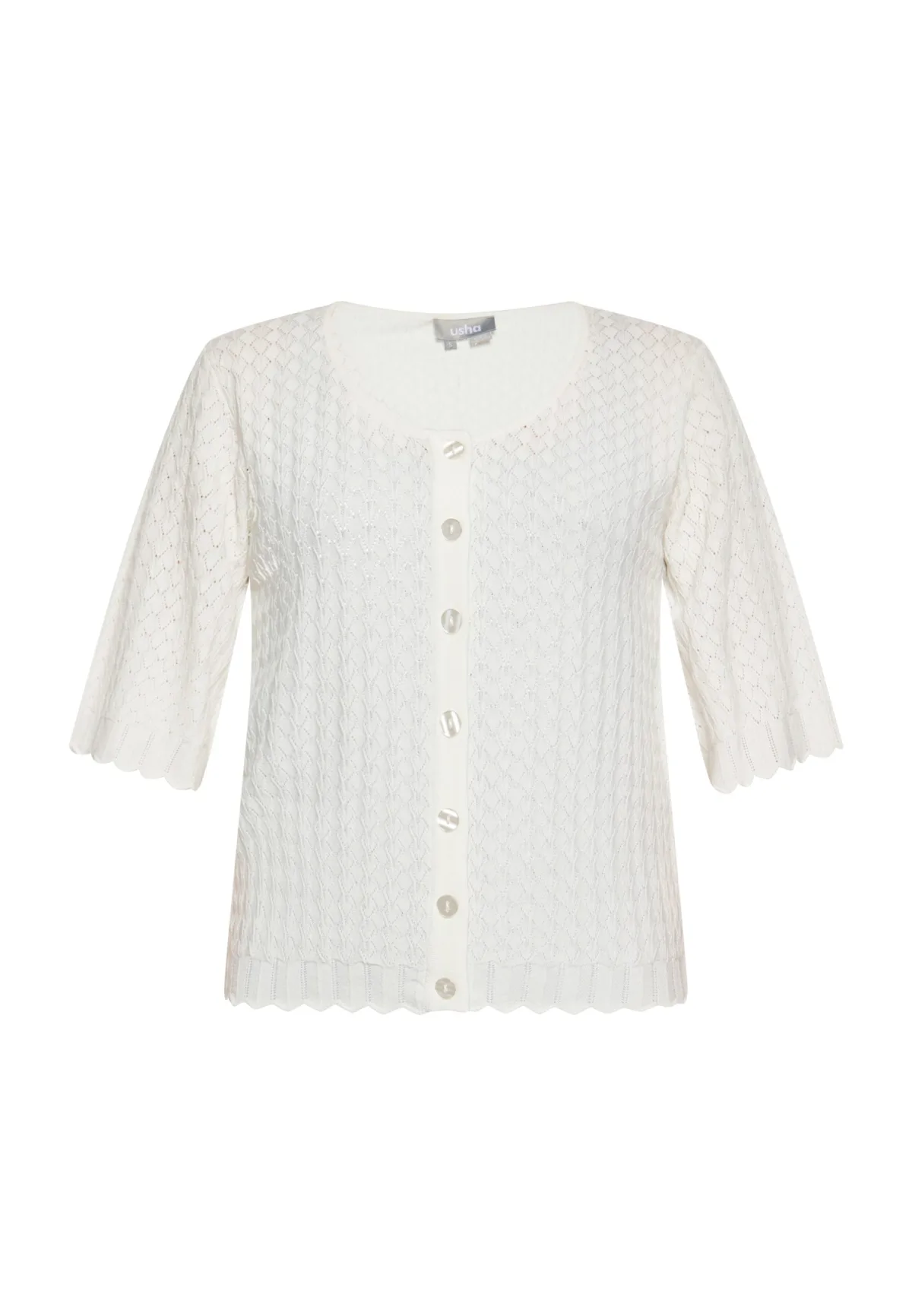 Ontdek de charme van dit delicate opengewerkte vest met korte mouwen, ontworpen om je casual garderobe naar een hoger niveau te tillen. De ingewikkelde structuur heeft een structuurpatroon en een geribbelde afwerking, terwijl de ronde halslijn en de knoopsluiting aan de voorkant voor veelzijdigheid zorgen. Dit gebreide kledingstuk is perfect om als laagje over elke outfit te dragen en is een must-have toevoeging. Vest
