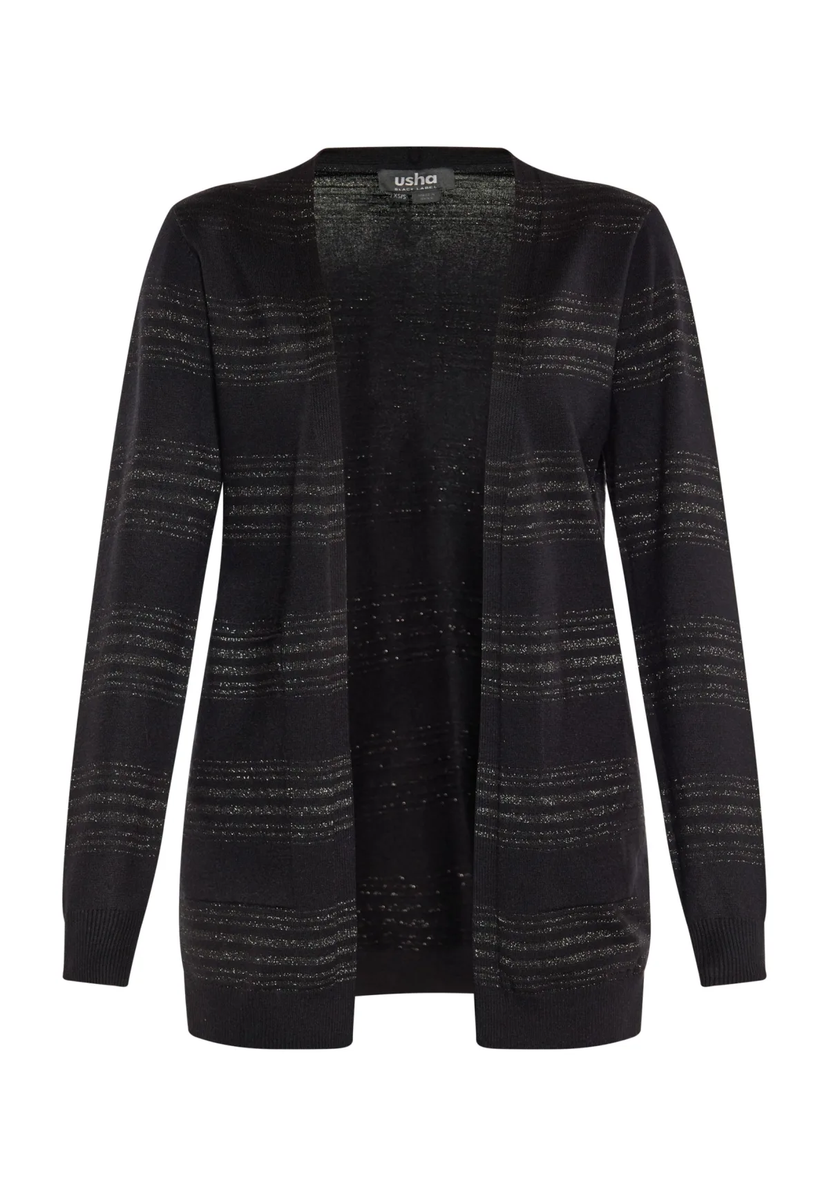 Onthul elegant met dit open vest met metallic strepen. Dit gebreide vest heeft lange mouwen en een rechte zoom, waardoor het een tijdloze charme uitstraalt. De geribbelde structuur bij de manchetten en onderzoom voegt finesse toe aan dit delicate gestreepte vest, waardoor het perfect is om in stijl te dragen. Vest