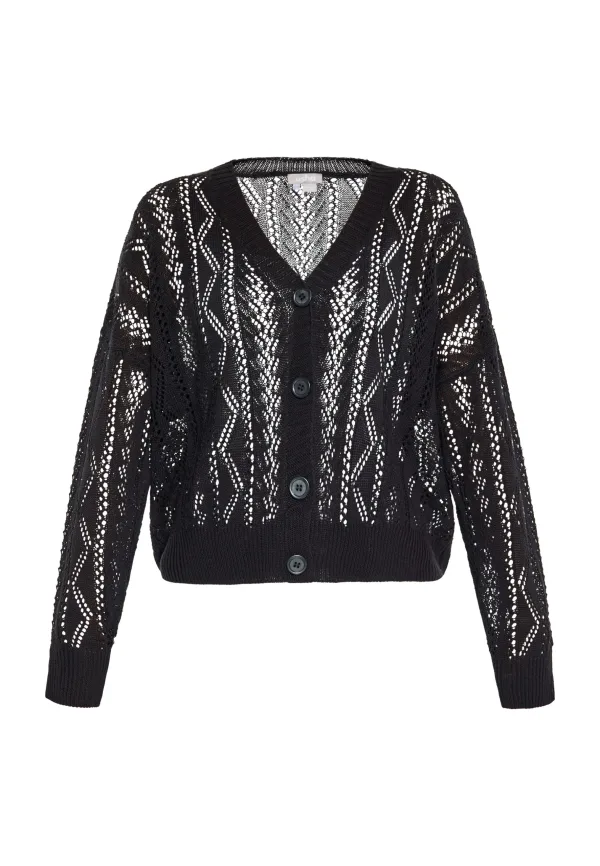Geef je casual stijl een boost met dit delicate opengewerkte vest, de fladderende V-hals en de knoopsluiting aan de voorkant. De ingewikkelde kantachtige steken voegen een decoratieve flair toe, terwijl de lange mouwen en geribde manchetten voor comfort zorgen. Dit relaxed-fit vest is gemaakt van rekbaar breiwerk en is perfect om de hele dag als laagje te dragen. Vest