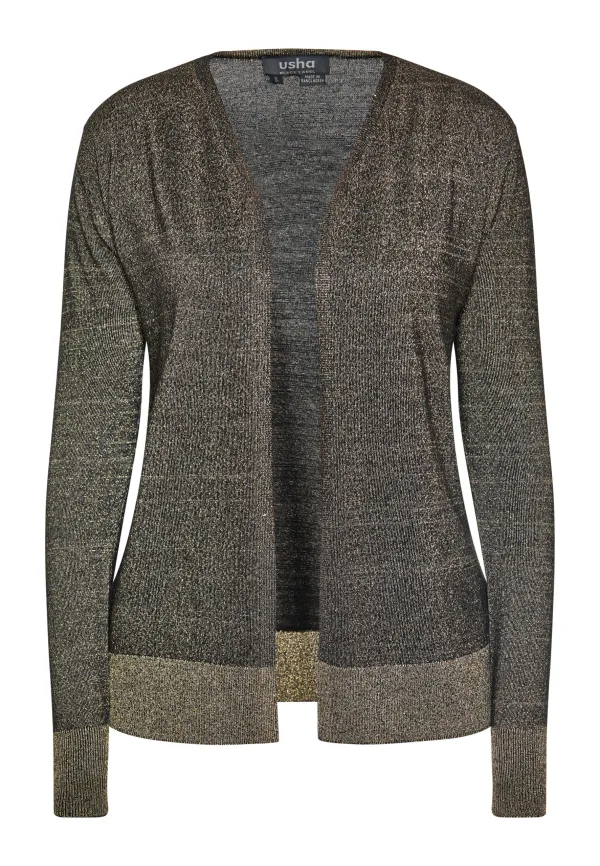 Geef je stijl een boost met dit open metallic vest, een prachtig gebreid exemplaar met een chique V-halslijn. De lange mouwen en geribde manchetten zorgen voor comfort, terwijl het relaxte silhouet elegant over je figuur valt. Dit korte vest is perfect voor mild tot koel weer en is een moeiteloze aanvulling op elke garderobe. Vest