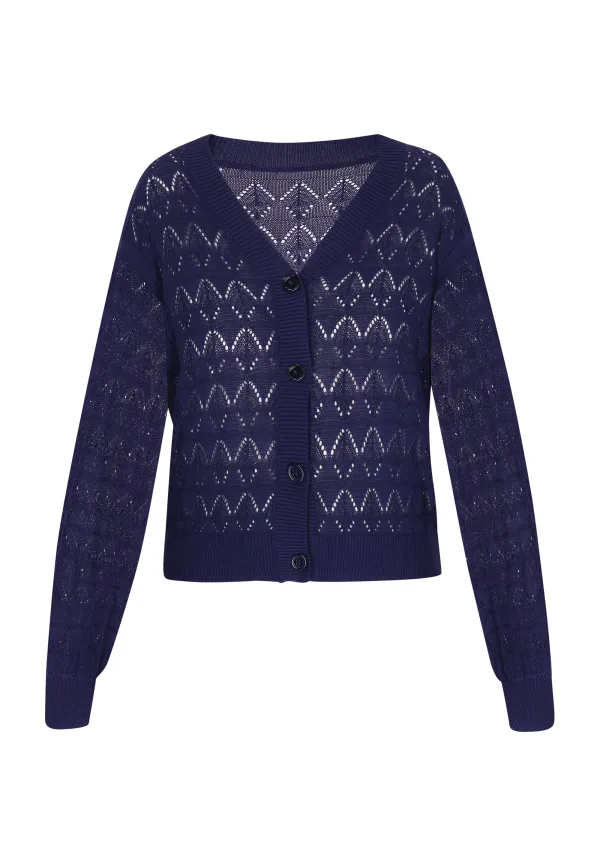 Fris je garderobe op met dit gebreide vest, ontworpen met alledaagse mode in gedachten. Met een V-hals en knoopjes aan de voorkant biedt het een relaxte pasvorm die zowel comfortabel als chic is. Lange mouwen zorgen voor warmte, terwijl het opengewerkte patroon een vleugje chic toevoegt. Dit vest is heerlijk comfortabel en een must-have voor casual uitjes. Onderdeel van de Comfy-collectie. Vest