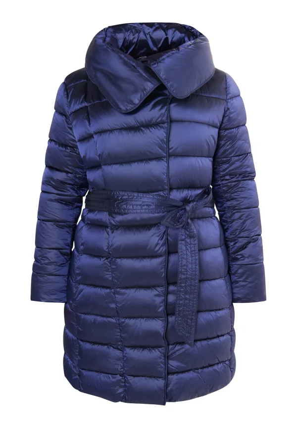 De gewatteerde plus-size gewatteerde jas van usha is perfect voor koude winterdagen. Het glanzende materiaal voelt zacht aan en sluit met een doorlopende ritssluiting. De riem van hetzelfde materiaal brengt het model naar de taille en biedt bescherming, net als de oversized kraag en de interne geribde manchetten aan de mouwen. Gewatteerde jas