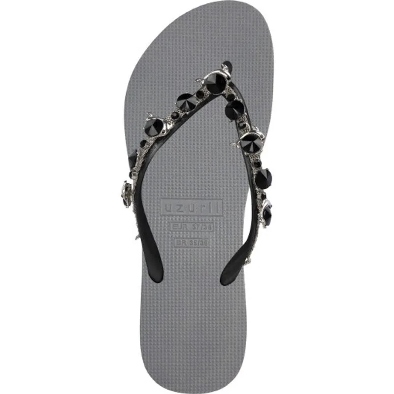 Wist je dat dolfijnen symbool staan voor speelsheid en vrijheid? De Black Dolphin slippers zijn versierd met kleine dolfijntjes en verschillende grote en kleine stenen. De zilveren ketting die over de V loopt is een stoer detail. Deze flip flops zijn jong, speels en gewaagd!Onze slippers zijn uniek, handgemaakt en met zorg en liefde ontworpen. De zool, die zijdezacht aanvoelt aan je voet, is gemaakt van rubber. De bandjes zijn gemaakt van PVC. De V kenmerkt zich door het originele Uzurii logo op de bandjes. Onze slippers worden gemaakt in China en BraziliÎ.