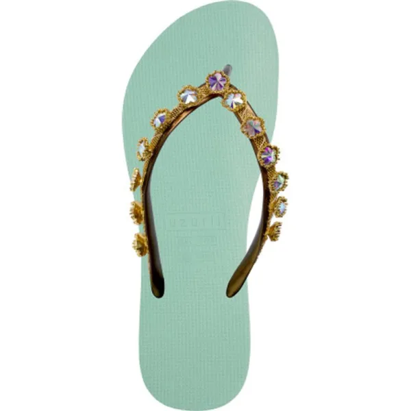 De steentjes in de vorm van een bloemetje op de Aby Flower geven de teenslipper een lieflijke uitstraling. Draag ze onder een stoere jeans of een fladderig zomerjurkje. De gouden details rondom de bloemetjes zorgen voor een sophisticated look. De kleur ëAbyí laat talloze verschillende kleuren en schitteringen zien in fel zonlicht. De V wordt bedekt door een gouden kettinkje en is versierd met het originele Uzurii logo over de bandjes.Onze slippers zijn uniek, handgemaakt en met aandacht ontworpen. De zool, die zijdezacht aanvoelt aan je voet, is gemaakt van rubber. De bandjes zijn gemaakt van PVC. De V kenmerkt zich door het originele Uzurii logo op de bandjes. Onze slippers worden gemaakt in China en BraziliÎ.