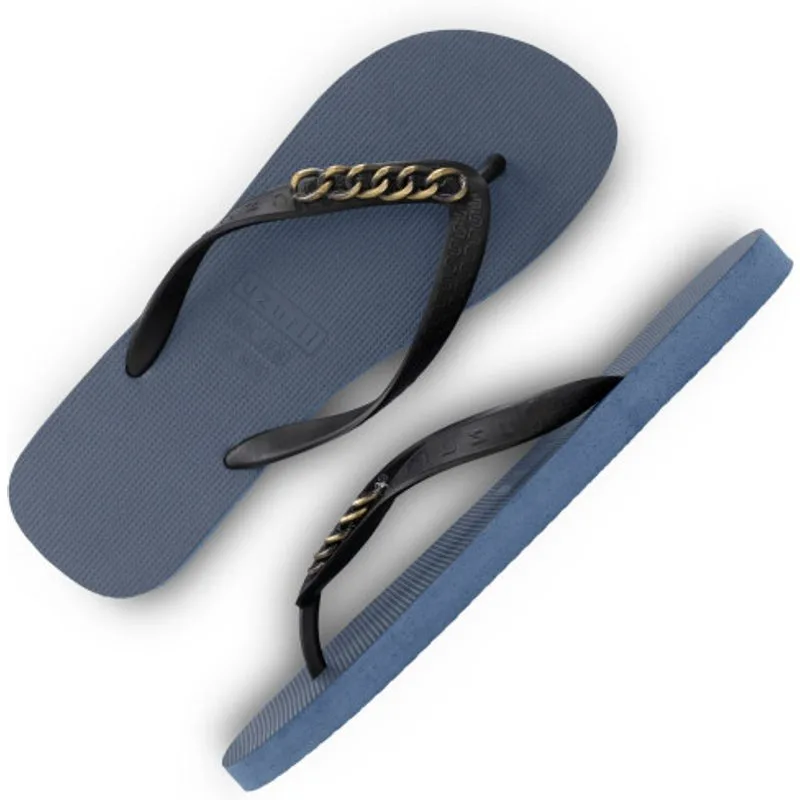 De slippers uit de Sport Collectie kenmerken zich door hun stoere ontwerp. De band is gedeeltelijk bedekt met een forse zilveren ketting. Deze handgemaakte slippers zijn een stijlvol statement piece dat op straat bijzonder in het oog zal vallen. Het experimenteren met edelstenen in talloze vormen, kleuren en texturen is wat onze ontwerpen kenmerkt. De V wordt gedetailleerd met het kenmerkende Uzurii logo over de bandjes. Slippers met open teen en een platte rubberzool. Rubber - PVC – Stenen Zoolhoogte: 1,5cm De V (band): Gemaakt in China Zool: Gemaakt in Brazilië