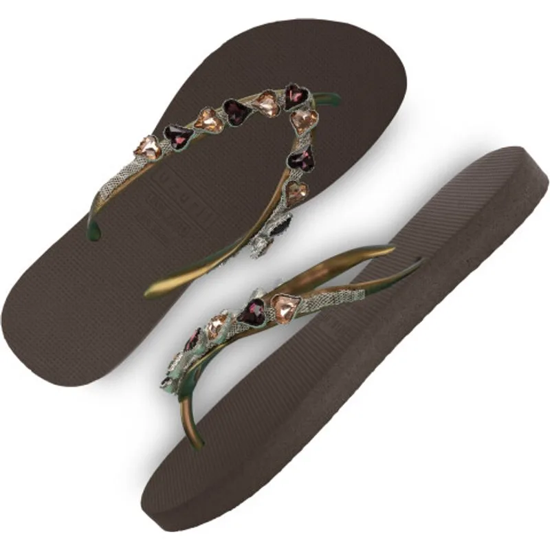 Ah, l'amour! Deze schattige, bronzen hartjes geven een schattige uitstraling aan de Heart Bronze teenslippers. De gouden ketting die over de V loopt is een stoere tegenhanger van de donkerrode en bronskleurige edelstenen. De bandjes zijn versierd met het originele Uzurii logo.Onze slippers zijn uniek, handgemaakt en met aandacht ontworpen. De zool, die zijdezacht aanvoelt aan je voet, is gemaakt van rubber. De bandjes zijn gemaakt van PVC. De V kenmerkt zich door het originele Uzurii logo op de bandjes. Onze slippers worden gemaakt in China en BraziliÎ