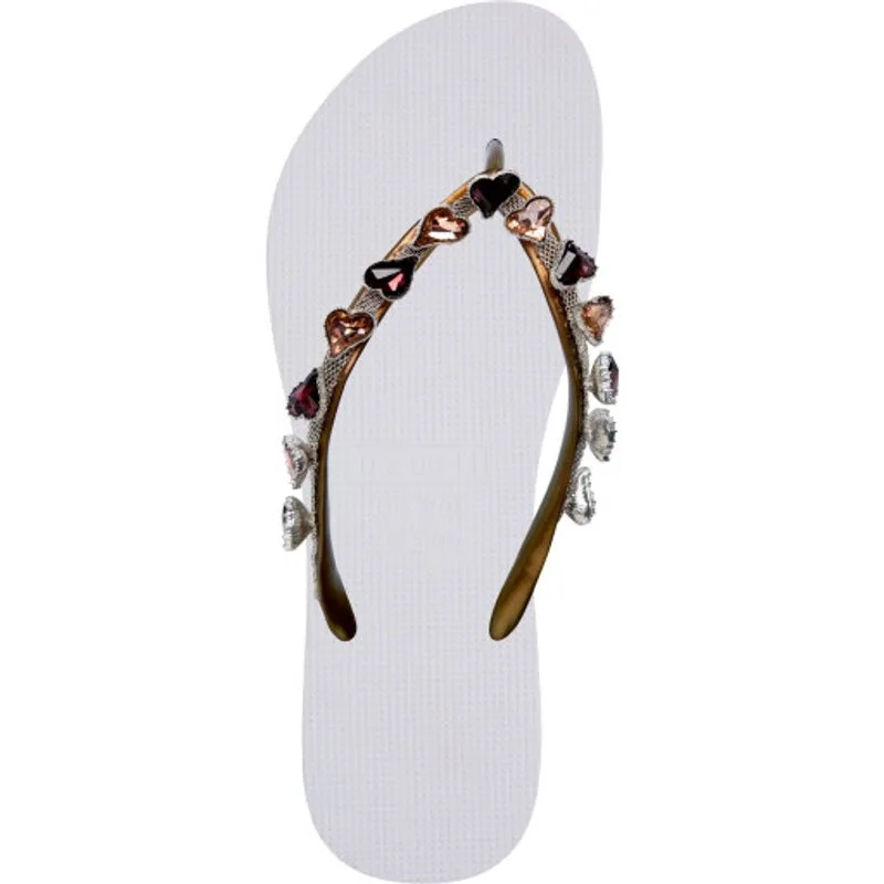 Ah, l'amour! Deze schattige, bronzen hartjes geven een schattige uitstraling aan de Heart Bronze teenslippers. De gouden ketting die over de V loopt is een stoere tegenhanger van de donkerrode en bronskleurige edelstenen. De bandjes zijn versierd met het originele Uzurii logo.Onze slippers zijn uniek, handgemaakt en met aandacht ontworpen. De zool, die zijdezacht aanvoelt aan je voet, is gemaakt van rubber. De bandjes zijn gemaakt van PVC. De V kenmerkt zich door het originele Uzurii logo op de bandjes. Onze slippers worden gemaakt in China en BraziliÎ
