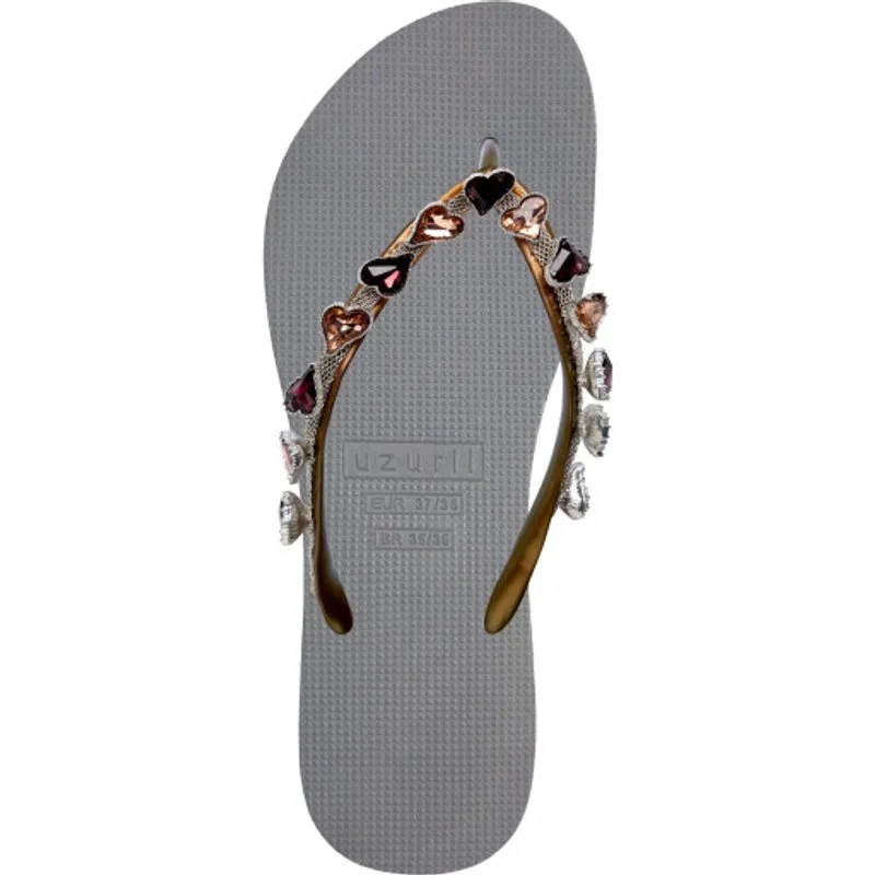 Ah, l'amour! Deze schattige, bronzen hartjes geven een schattige uitstraling aan de Heart Bronze teenslippers. De gouden ketting die over de V loopt is een stoere tegenhanger van de donkerrode en bronskleurige edelstenen. De bandjes zijn versierd met het originele Uzurii logo.Onze slippers zijn uniek, handgemaakt en met aandacht ontworpen. De zool, die zijdezacht aanvoelt aan je voet, is gemaakt van rubber. De bandjes zijn gemaakt van PVC. De V kenmerkt zich door het originele Uzurii logo op de bandjes. Onze slippers worden gemaakt in China en BraziliÎ