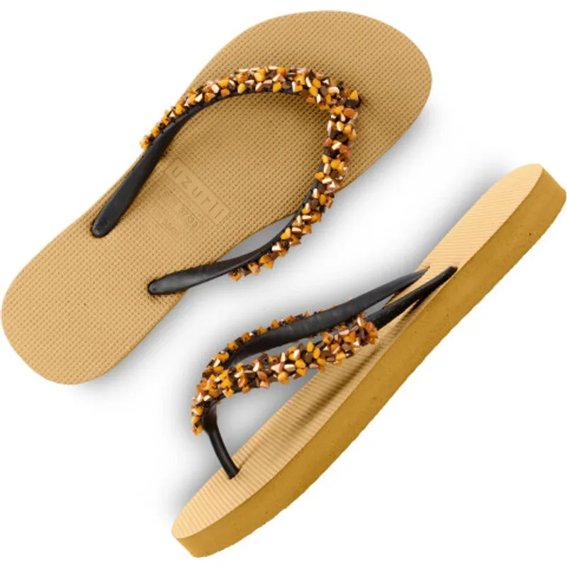 De kleur van de stenen is zeer zeldzaam, wat de stijl uitzonderlijker maakt. De honingstenen zijn met een speciale techniek aan de V bevestigd. Deze handgemaakte slippers zijn een stijlvol statement piece dat op straat bijzonder in het oog zal vallen. Het experimenteren met edelstenen in talloze vormen, kleuren en texturen is wat onze ontwerpen kenmerkt. De V wordt gedetailleerd met het kenmerkende Uzurii logo over de bandjes. Slippers met open teen en een platte rubberzool. Rubber - PVC – Stenen Zoolhoogte: 1,5cm De V (band): Gemaakt in China Zool: Gemaakt in Brazilië