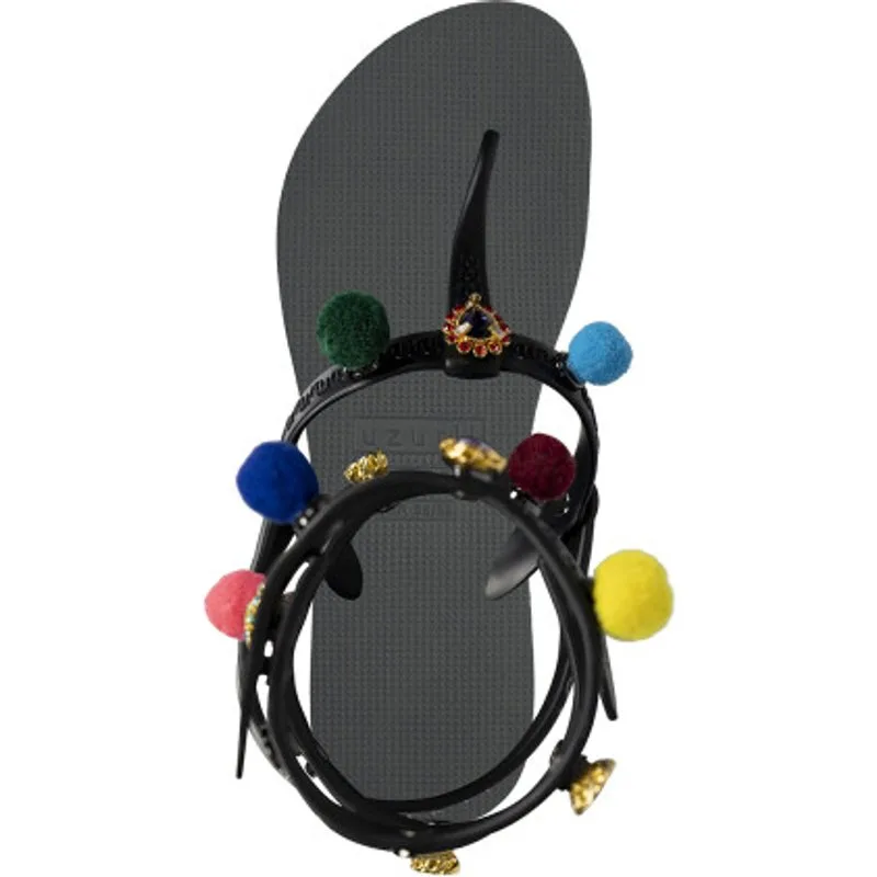 Waan je op Ibiza met onze Mystique Pompom! Deze sandalen herken je aan de pompons en kleurrijke stenen. Door de drukknoopjes, kun je de pompons en stenen zelf verwisselen. Kies uit een groot aantal stenen uit onze accessoires lijn. Geef je slippers in een handomdraai een nieuwe look. Op zoek naar comfort? De Mystique Pompom geeft extra steun door de bandjes over de hiel.Onze slippers zijn uniek, handgemaakt en met zorg en liefde ontworpen. De zool, die zijdezacht aanvoelt aan je voet, is gemaakt van rubber. De bandjes zijn gemaakt van PVC. De V kenmerkt zich door het originele Uzurii logo op de bandjes. Onze slippers worden gemaakt in China en BraziliÎ.